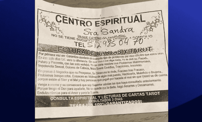 Una familia hispana de Texas denunció que una mujer que contrataron para que realizara una "limpia" espiritual en su casa les robó 30 mil dólares que tenían en una caja fuerte para comprar una propiedad, informó este sábado Univision.El robo ocurrió en el área de Round Rock, en el centro de Texas, y está siendo investigado por la Oficina del Alguacil del condado Williamson.La familia contrató los servicios de una "espiritista" llamada Sandra que ofrecía "limpias" para lograr salud y prosperidad y que paradójicamente los dejó con menos dinero del que tenían."Era un 'down payment' (pago inicial) que teníamos para una casa y tristemente se llevó ahí todos los sueños y planes que teníamos de tanto esfuerzo y tanta lucha", indicó la madre de familia, que no quiso ser identificada.El canal hispano Univisión publicó en su web una fotografía del panfleto que entregaba "Sandra" en los estacionamientos de los supermercados latinos de la zona."Ella vino varios días, prendía unas veladoras, se ponía a rezar, pero cuando iba a venir la semana pasada ya no regresó. Mi esposo la estuvo esperando y ella ya no contestó la llamada", indicó la víctima del robo.Cuando se le preguntó a la familia por cómo "Sandra" llegó a tener acceso a la caja fuerte, el esposo dijo a Univision 62 que en un descuido dejaron las llaves en una de las mesas de la habitación cerca de la caja fuerte.JM