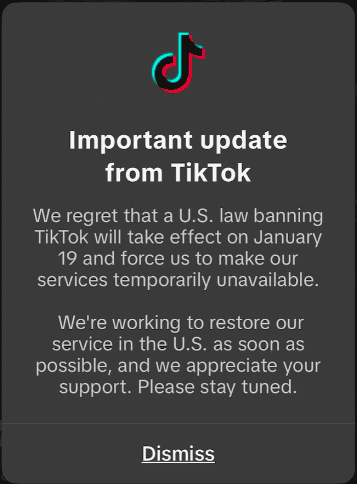 TikTok informó este sábado a sus 170 millones de usuarios en Estados Unidos que ya no estará disponible “temporalmente”, esto luego de que el Tribunal Supremo dio el viernes luz verde a una ley que obliga a la red social a suspender sus operaciones en el país antes del 19 de enero por no haberse desvinculado de su empresa matriz, la china ByteDance. Las y los usuarios de TikTok en Estados Unidos dieron a conocer que al abrir la aplicación encontraron un mensaje que decía:“Lamentamos que la ley que prohíbe Tiktok entre en vigor el 19 de enero y nos obligue a interrumpir temporalmente nuestros servicios.Estamos trabajando para restablecer nuestros servicios en EE.UU. lo antes posible, y agradecemos su apoyo. Permanezcan atentos. “Cabe destacar que según la ley, la empresa matriz de TikTok con sede en China, ByteDance, tenía nueve meses para vender la operación estadounidense de la plataforma a un comprador autorizado. La ley permite al presidente en funciones otorgar una extensión de 90 días si una venta está en proceso.Por lo anterior, este sábado el presidente electo estadounidense, Donald Trump, afirmó que "probablemente" concederá a TikTok una prórroga de 90 días para evitar su prohibición en Estados Unidos."Creo que esa sería, sin duda, una opción a tener en cuenta. La extensión de 90 días es algo que probablemente se hará, porque es apropiado. Tenemos que analizarlo con cuidado. Es una situación muy importante", dijo en una entrevista telefónica con la cadena NBC News.En principio, sería responsabilidad del presidente saliente, Joe Biden, tomar las medidas necesarias ese día para asegurar que la red social deje de operar por motivos de seguridad nacional. Sin embargo, la Casa Blanca ha optado por transferir esa responsabilidad a Donald Trump, quien asumirá el cargo el 20 de enero.Con información de EFE y AP.NA