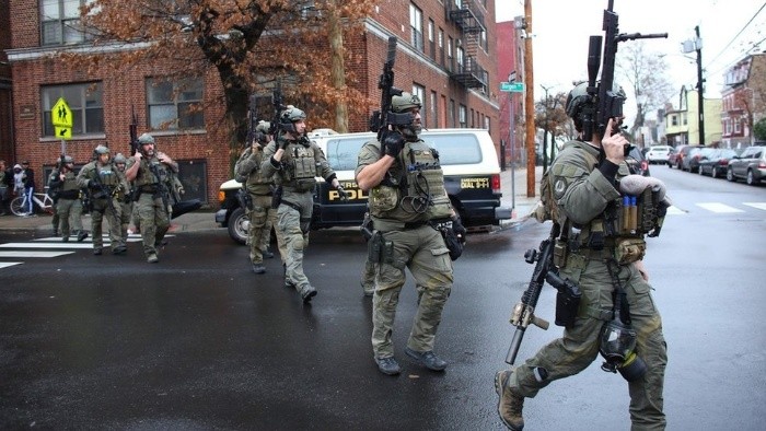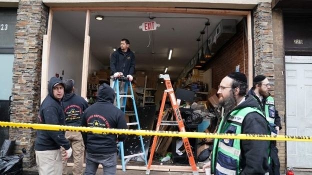 Durante cuatro largas horas, los alrededores de un supermercado judío este martes en Jersey City (Nueva Jersey) se convirtieron en una especie de campo de batalla.Dos personas armadas no identificadas entraron disparando dentro del local donde luego se atrincheraron mientras se enzarzaron en un duro enfrentamiento a tiros con la policía."Esto era como una zona de guerra", le dijo un testigo a la televisora estadounidense CBS acerca de la tarde sangrienta que se saldó con la muerte de seis personas, incluyendo un policía y los dos atacantes."Este es uno de los mayores tiroteos que ha visto en mucho tiempo. Y yo estuve en Vietnam", le dijo Willy McDonald, otro testigo de 67 años de edad, al diario The New York Times.Aún se desconocen qué motivó el ataque pero la policía de New Jersey ha dicho que el objetivo era el supermercado judío, mientras que el alcalde Steven Fulop ha dicho que "el odio y el antisemitismo" no tienen cabida en esa ciudad.Pero, ¿qué ocurrió?El jefe de policía de New Jersey, Mike Kelly, explicó que el episodio de violencia se inició en un cementerio ubicado a 1,6 kilómetros del supermercado, en torno al mediodía del martes.Entonces, se cree que el detective Joseph Seals -quien formaba parte de un programa estatal para confiscar armas ilegales- fue asesinado cuando se acercó a dos sospechosos que se encontraban a bordo de una camioneta sospechosa de estar vinculada con un homicidio reciente.La pareja, un hombre y una mujer, abandonó el lugar y se dirigieron hacia el supermercado judío donde entraron disparando de forma indiscriminada, llamando la atención de dos policías que se encontraban patrullando a pie por la zona y que fueron los primeros en atender la emergencia.Aunque oficialmente no se conocen las causas del ataque, el alcalde Fulop le dijo a la prensa que las cámaras de seguridad de la zona muestran cómo los sospechosos se dirigieron "lentamente" hacia el supermercado, luego "calmadamente abrieron la puerta con dos rifles y comenzaron a disparar dentro de la tienda".El director de Seguridad Pública de la ciudad, James Shea, agregó que cuando se bajaron de la camioneta, los sospechosos pasaron al lado de muchas personas pero siguieron avanzando sin disparar hasta que llegaron a la tienda.Según dijo este miércoles The New York Times, uno de los sospechosos había publicado en internet declaraciones contra los judíos y en contra de la policía. Esa información, sin embargo, no ha sido confirmada oficialmente.Además del detective Seals y de los dos sospechosos que cayeron en el enfrentamiento con la policía, dentro de la tienda fallecieron tres personas.Aunque las autoridades no han revelado la identidad de estas personas, líderes de la comunidad judía jasídica que hace vida en la ciudad identificaron a dos de sus miembros como víctimas del ataque en el supermercado.Una de ellas era Leah Minda Ferencz, de 33 años de edad, quien se encontraba entonces atendiendo el supermercado propiedad de ella y de su marido Moshe, quien en ese momento no se encontraba en el lugar.La otra víctima identificada por la comunidad era Moshe Deutsch, un estudiante de Estudios Rabínicos de 24 años de edad.Ahora puedes recibir notificaciones de BBC Mundo. Descarga la nueva versión de nuestra app y actívalas para no perderte nuestro mejor contenido.JM