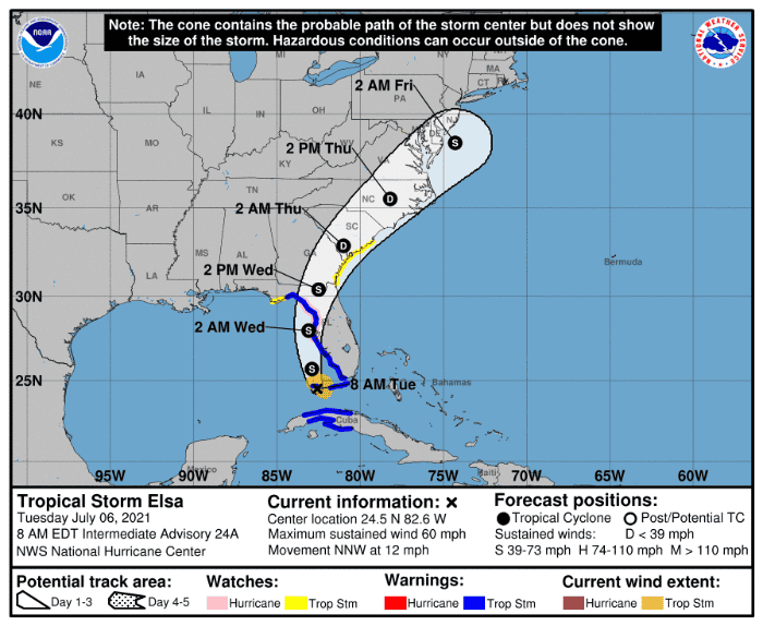 Los Cayos y la costa oeste de Florida están en situación de emergencia ante la llegada de la tormenta tropical "Elsa", cuyas lluvias y aparato eléctrico dificultan ya las tareas de los rescatistas que buscan víctimas del derrumbe en Miami-Dade, que, aun así, han dado en las últimas horas con cuatro cuerpos más."Elsa", que fue el primer huracán de 2021 en el Atlántico, puede alcanzar de nuevo esa categoría antes de tocar tierra en algún punto de la parte norte de la costa oeste de Florida el miércoles, según ha advertido el Centro Nacional de Huracanes (NHC).No será la primera tormenta en tocar tierra en EU este año. "Claudette" impactó en junio en Alabama, donde se registró una decena de muertos en accidentes relacionados, y "Danny" lo hizo en Carolina del Sur sin causar daños de importancia.Veintidós de los 67 condados en que se divide Florida han sido declarados en emergencia, pero, como dijo el gobernador Ron DeSantis, no solo los lugares que están en el cono de trayectoria pueden sufrir las consecuencias de "Elsa".En Miami-Dade, que está en la costa este, ribereña del Atlántico, las lluvias de las bandas exteriores de "Elsa", acompañada de aparato eléctrico, han obligado a hacer pausas a los rescatistas que trabajan en los escombros del edificio Champlain Towers South, que fue demolido totalmente el pasado domingo, 4 de julio.Según la alcaldesa del condado Miami-Dade, Daniella Levine Cava, a día de hoy ya son 32 las víctimas confirmadas del derrumbe del ala noreste del edificio ocurrido el 24 de junio y quedan 113 personas sin localizar.Cuatro cuerpos más fueron extraídos de los escombros desde el lunes por la tarde.Los Cayos de Florida, el rosario de islas entre la Florida continental y Cuba, tampoco van a recibir el impacto directo de "Elsa", pero ya están sufriendo su cercanía en forma de vientos, lluvia y marejadas.En Cayo Hueso, un destino turístico internacional, el transporte público está suspendido desde este lunes, las oficinas públicas y las escuelas cerradas este martes y no hay servicios como recogida de basuras, según informó la Alcaldía de la ciudad.Las tiendas permanecían abiertas.Un vecino, citado por un medio local, dijo que para la gente de los Cayos, que ha soportado huracanes como el devastador Andrew (1992), esto es "solo lluvia".El aeropuerto de Key West no anunció el cierre al tráfico pero confirmó varias cancelaciones de vuelos.El que sí cerrará a partir de la tarde de hoy es el aeropuerto de Tampa, una ciudad del centro de Florida que está dentro de la zona puesta bajo vigilancia de huracán por el Centro Nacional de Huracanes (NHC) de EU.La zona va desde Egmont Key, en la Bahía de Tampa, hasta la desembocadura del río Steinhatchee, en el norte de la costa oeste.Según el NHC, a las 11.00 horas de Miami (16.00 GMT) el centro de "Elsa", que esta mañana dejó atrás Cuba y pasó cerca de los cayos más occidentales, estaba a unos 345 km al sur de Tampa.Los vientos máximos sostenidos eran de 90 km por hora y alcanzaban una distancia de 110 km del centro.La tormenta se mueve a 17 km/h hacia el nornoroeste y va a mantener esa dirección hasta el miércoles, cuando gire al norte-noreste.El miércoles por la mañana tocará tierra y después, más débil, girará hacia el noreste y cruzará Georgia y Carolina del Sur el jueves en busca de una salida al Atlántico.El gobernador Ron Desantis instó esta mañana a la población a estar preparada para la tormenta y a mantenerse informada sobre la situación por si hay cambios.Según dijo, unos 250 Guardias Nacionales (reservistas) de Florida han sido llamados para ayudar en esta emergencia.La vicegobernadora de Florida, Jeanette Núñez, que estuvo esta mañana en una conferencia de prensa en Surfside, indicó que se han tomado todas las medidas de emergencia necesarias y habilitado refugios en la costa oeste para quienes decidan dejar sus residencias mientras pasa la tormenta.GC