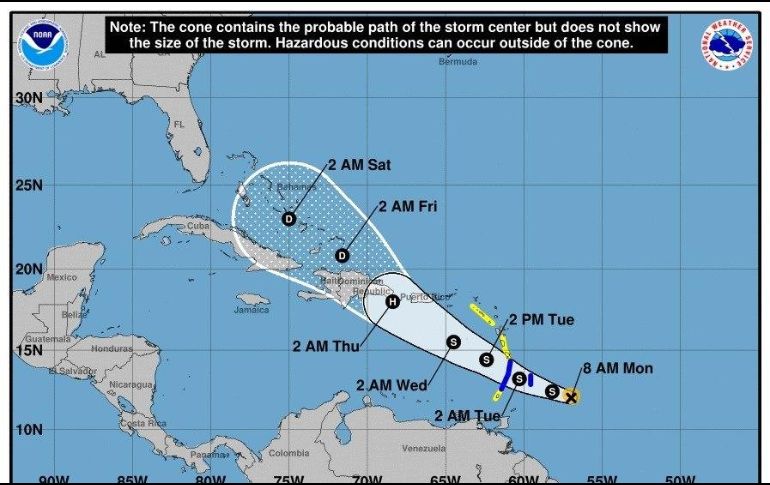 La tormenta tropical Dorian se intensificó este lunes y afecta las Islas de Barlovento, en una ruta que la llevará cerca de Puerto Rico y República Dominicana tal vez convertida en un huracán, informaron meteorólogos estadounidenses.La tormenta se desplaza en dirección a Florida, en el sureste de Estados Unidos, pero es pronto para saber cómo afectará esta región.Según los meteorólogos, puede disiparse durante su paso por los terrenos montañosos de la isla La Española, que es compartida por República Dominicana y Haití.Con vientos máximos sostenidos de 95 km/h, Dorian "seguirá intensificándose y podría estar cerca de tener fuerza de huracán cuando pase por el norte de las Islas de Barlovento el martes, y se espera que sea un huracán cuando se desplace cerca de Puerto Rico y el este de La Española", escribió el Centro Nacional de Huracanes (NHC).El NHC calcula que Dorian pasará cerca de las Islas de Barlovento (parte de las Antillas menores) en la tarde o la noche del lunes y se desplazará por el mar Caribe el martes."Se espera que pase cerca o al sur de Puerto Rico el miércoles y alcance el este de la isla Española el miércoles por la noche", añadió.El NHC emitió una alerta de huracán para la isla de Santa Lucía y advertencias de tormenta tropical para Puerto Rico, Barbados, Martinica y San Vicente y Granadinas.Quiere decir que el huracán podría afectar Santa Lucía en las próximas 24 horas, y que el resto de las islas podrían estar bajo efectos de tormenta tropical en las próximas 36 horas.Esta zona padeció los estragos del monstruoso huracán María en septiembre de 2017. Puerto Rico quedó incomunicado y grandes áreas carecieron de electricidad durante meses. Casi 3.000 personas murieron a consecuencia del desastre, según el balance oficial.Dorian es un ciclón tropical pequeño, con vientos que se extienden solamente 75 km desde su centro.Según el boletín del NHC de las 20H00 GMT, la tormenta estaba 95 km al sureste de Barbados y se desplazaba hacia el este-noroeste a 22 km por hora.JB