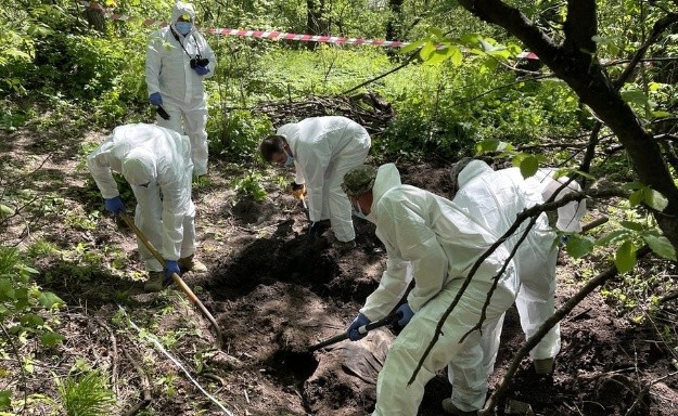 Cuando sus perros comenzaron a cavar insistentemente en un lugar del bosque, los habitantes de Zavalivka llamaron a las autoridades.Un equipo militar ucraniano pronto llegó al lugar con trajes protectores blancos, quitando cuidadosamente la capa superior del suelo.Descubrieron el cuerpo de un hombre, boca abajo, con las piernas extrañamente torcidas debajo de él. Estaba claro por su uniforme que era un soldado ruso.Semanas después de que fracasaron en su intento de apoderarse de la capital de Ucrania, los restos de tropas rusas todavía están siendo hallados en y alrededor de las aldeas por las que pasaron u ocuparon cerca de la capital, Kiev. Pero Ucrania dice que Rusia muestra poco interés por recuperarlos.Desde la tumba en el bosque, el cuerpo fue trasladado a un tren refrigerado en las afueras de Kiev que ahora funciona como una morgue móvil para los muertos rusos.Las bolsas de plástico blanco están marcadas con números en lugar de nombres. Al menos 137 estaban apiladas dentro de dos vagones el día que visitamos.Los ucranianos intentan identificar a los muertos: en el cuerpo que acaban de traer, el equipo forense encontró dos tarjetas bancarias, así como insignias de una brigada rusa motorizada de fusileros."Al menos este tiene la oportunidad de llegar a casa", anunció el hombre a cargo, mostrando los hallazgos, incluido un fragmento sucio de una camiseta impresa con el logotipo del ejército de Rusia.Momentos después, confirmé que el hombre que acababa de ser exhumado era un joven soldado casado, procedente de Siberia. Cerca de su bolsa para cadáveres, una fotografía en blanco y negro cuidadosamente posada de su perfil de redes sociales miraba desde mi teléfono.Rusia tiene un eslogan del que presumen con orgullo: "No abandonamos a los nuestros". En gran medida ha sido una parte importante de la supuesta justificación del presidente Vladimir Putin para invadir Ucrania, pues él afirmó falsamente que los rusoparlantes necesitaban protección.Esa promesa parece no aplicarse tanto a los propios soldados de Rusia."Los cuerpos que hemos encontrado muestran que tratan a las personas como basura, como carne de cañón. No necesitan a sus soldados. Los arrojan aquí, se retiran y dejan los cuerpos", dijo a la BBC el coronel Volodymyr Liamzin.En realidad, no sabemos cómo fue abandonado el joven soldado del bosque. Los aldeanos de Zavalivka dicen que en ese momento se escondían en sus sótanos de los bombardeos; suponen que resultó herido y se perdió cuando su unidad se vio obligada a retirarse.Por lo que hemos aprendido de las tropas rusas que lucharon alrededor de Kiev, muchos eran jóvenes e inexpertos. Es probable que estuvieran huyendo bajo fuego."Hicimos un intercambio", dice el coronel Liamzin, explicando que la parte rusa proporcionó una lista corta de los soldados muertos que quería que regresaran."Estamos listos para devolverlos a todos, queremos que nos devuelvan a nuestros propios muertos también. Tocamos todas las puertas que hay, pero no hay respuesta, no hay diálogo", dice el coronel.El retraso en la recogida de cadáveres no es exclusivo de Rusia.Ninguno de los bandos en esta guerra es transparente sobre el número de bajas sufridas. Hemos hablado con varias familias ucranianas que dicen que su propio gobierno ha sido de poca ayuda para recuperar los restos de los soldados ucranianos del campo de batalla.Una mujer, a quien los hombres de su unidad le informaron de la muerte de su esposo, dijo que estuvo tratando de recuperar su cuerpo durante casi tres meses.Pero aquí constantemente hallan cuerpos de los muertos rusos.Justo en la carretera de Zavalivka en Sytnyaky, el anciano del pueblo nos dijo que al menos 10 soldados rusos -probablemente más- murieron y sus cuerpos fueron abandonados en marzo.Su columna fue emboscada tras perderse: los lugareños habían quitado y cambiado las señales de tráfico.La batalla fue feroz. Lo que una vez fue un restaurante al borde de la carretera en el lugar ahora es un montón de escombros, apenas queda en pie un trozo de pared y un acuario gigante que de alguna manera sobrevivió al asalto.Los panfletos hallados en las ruinas piden a los soldados rusos que se rindan y salven sus vidas, y perdonen la sangre de los niños ucranianos.El anciano del pueblo dice que él y otros enterraron a los rusos después de la batalla "por razones sanitarias". Cuando miro incrédula, dice que la mayoría volaron en pedazos.No le permitieron mostrarnos las tumbas: constituyen una escena del crimen hasta que el equipo del coronel Liamzin pueda visitar y exhumar los restos del lugar. Pero su lista de excavaciones ya es larga.Un lugareño que estaba plantando remolacha confirma que los rusos murieron a lo largo de la carretera principal."No es humano abandonar a un soldado, no enterrarlo", dice Mikola, apoyándose en su pala. Su propio hijo está en el ejército de Ucrania."Mi esposa sintió pena por los rusos al principio, pero luego nos enteramos de lo que hicieron aquí", agrega, refiriéndose a los disparos contra civiles desarmados en lugares como Bucha e Irpin."Después de eso, nadie siente pena por los rusos", apunta.Los restos quemados de los tanques rusos todavía se alinean en todas las carreteras principales hacia Kiev. Cada pocos segundos, los autos se detienen y las familias salen para tomar fotografías, los niños trepan por la parte superior.Parece algo catártico. El otro día vi a un hombre haciendo ejercicio, levantando el barril de un tanque por encima de su cabeza, como si estuviera haciendo pesas.Pero ese mismo día, a solo unos pasos del otro lado de la carretera, vimos restos humanos en un trozo quemado del borde: un trozo de columna carbonizado y un fragmento de pie; y un olor dulce y mortal cuando amainó el viento. Lo más probable es que fuera uno de los hombres muertos en uno de los tanques cercanos.Así que el tren frigorífico en Kiev todavía se está llenando y hay más en otras ciudades cercanas a l