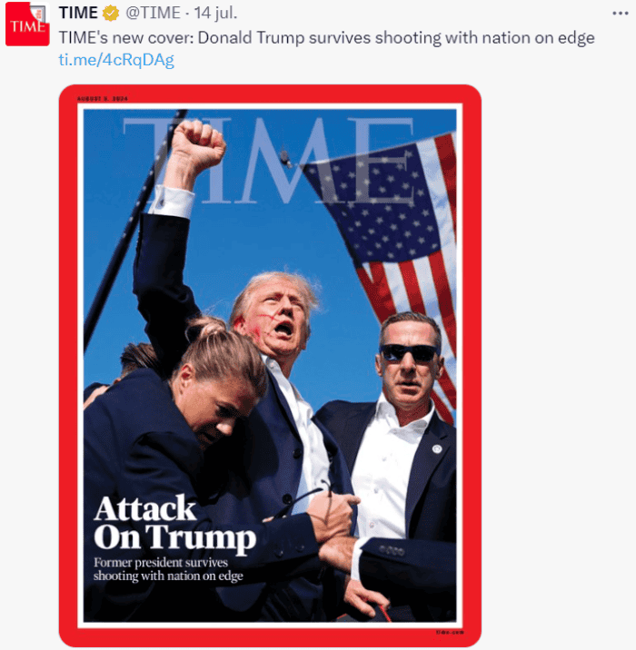 El intento de asesinato al expresidente de Estados Unidos, Donald Trump, durante un evento de campaña en Butler, Pensilvania, ha sacudido y conmocionado a una nación que enfrenta problemáticas en relación con la regulación y venta de armas, combinado de una serie de discursos de odio y enfrentamientos entre demócratas y republicanos en la carrera por las elecciones del próximo 5 de noviembre.Los titulares de distintos periódicos del mundo no hablan de otro tema. Precisamente, la revista "TIME", una de las más longevas de ese país, dedicó su portada a dicho acontecimiento de proporcional envergadura.El shoot muestra a un Donald Trump en una postura digna de un mártir, que no ha pasado de largo para usuarios de redes sociales, quienes incluso lo han llegado a comparar con "La Libertad guiando al pueblo" del pintor francés exponente del romanticismo, Eugène Delacroix.La fotografía que apareció en "TIME", además, estuvo acompañada de un artículo de Eric Cortellessa en donde este hace un recuento de los pormenores sobre lo ocurrido la tarde de ayer sábado."Trump estaba hablando en el mitin alrededor de las 6:15 pm cuando se escucharon una serie de fuertes estallidos. El expresidente se agarró la oreja derecha antes de tirarse al suelo. Los agentes se apresuraron a subir al escenario, cubriendo a Trump, antes de acompañarlo a un vehículo que lo esperaba", recuerda.Asimismo, de acuerdo con un portavoz del Servicio Secreto, Cortellessa indicó que los disparos fueron realizados por un tirador apostado fuera del lugar donde se llevaba a cabo el evento."Un asistente murió y otros dos resultaron gravemente heridos, dijo [Anthony] Guglielmi en un comunicado. El presunto tirador fue 'neutralizado por un agente del Servicio Secreto y luego murió, dijo Guglielmi'", apuntó.Sumado a ello, dio a conocer varios testimonios de personas que estuvieron en el lugar de los hechos: "James Sweetland, un médico de urgencias jubilado, dijo a "TIME" en el lugar que le practicó RCP a un hombre que había recibido un disparo en la cabeza y al que le salía sangre de la boca. 'No respiraba', dijo Sweetland, de 70 años, cuya camisa estaba manchada de sangre. 'Conseguí que otras personas me ayudaran a sentarlo en uno de los bancos y le hicimos RCP. No podía sentir el pulso'. No estaba claro si el hombre sobrevivió".Otra declaración para la revista fue la de un hombre identificado como Scott Sosso, de 47 años, quien narró que en el momento en que se desató el tiroteo, él se encontraba en la zona de gradas junto a su hijo Luka, de 18. "'Se oye pop, pop, pop', dijo Sosso. 'Diez segundos después, se oye: '¡Alguien ha recibido un disparo!'. Lo siguiente que sabes es que todo el mundo se ha agachado en nuestra sección'".También, Cortellessa recuperó las palabras del presidente Joe Biden, quien reveló a medios que "'no hay lugar en Estados Unidos para este tipo de violencia'. 'Es enfermizo. Es enfermizo. Es una de las razones por las que tenemos que unir al país. No podemos permitir que esto suceda. No podemos ser así. No podemos tolerar esto'", y agregó Biden que intentaba comunicarse con su rival en la contienda por las presidenciales.La opinión pública tanto de Estados Unidos como del resto del mundo condenó el ataque. Fue el propio Donald Trump Jr. el que declaró a "TIME" en un mensaje de texto que "su padre estaba 'de muy buen ánimo. Nunca dejará de luchar para salvar a Estados Unidos, sin importar lo que la izquierda radical le arroje'", concluyó.* * * Mantente al día con las noticias, únete a nuestro canal de WhatsApp * * *OA