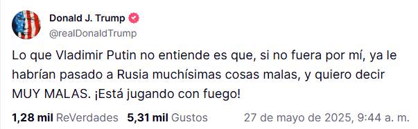 El presidente de Estados Unidos, Donald Trump, advirtió hoy martes 27 de mayo a su homólogo de Rusia, Vladímir Putin, que "está jugando con fuego" al negarse a detener los ataques contra Ucrania."Lo que Vladímir Putin no entiende es que, si no fuera por mí, a Rusia ya le habrían ocurrido muchísimas cosas malas, y quiero decir MUY MALAS. ¡Está jugando con fuego! ", afirmó Trump en la plataforma Truth Social.El mandatario republicano insistió así en sus declaraciones del domingo ante la prensa cuando criticó los últimos ataques masivos de Rusia contra Ucrania y dijo que está meditando imponer sanciones a Moscú porque Putin "está matando a mucha gente".Ese mismo día, declaró también en Truth Social que siempre ha tenido una "muy buena relación" con el presidente ruso, pero que este "se ha vuelto completamente loco".Trump advirtió además que si el jefe del Kremlin busca invadir toda Ucrania, lo único que logrará es "la caída de Rusia".Desde su regreso al poder en enero, Trump ha impulsado un acuerdo de paz para poner fin a la guerra en Ucrania, con un acercamiento hacia Rusia y duras críticas al presidente ucraniano, Volodímir Zelenski.Sin embargo, en las últimas semanas ha intensificado la presión sobre Moscú y ha amenazado con nuevas sanciones a Rusia ante la negativa de Vladímir Putin a aceptar una tregua que Zelenski sí está dispuesto a acatar.*Mantente al día con las noticias, únete a nuestro canal de WhatsAppOF