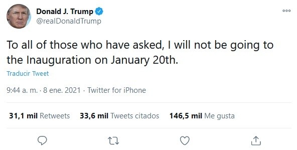 Donald Trump, presidente de Estados Unidos (EU), anunció este viernes que no asistirá a la toma de posesión de su sucesor, el demócrata Joe Biden el próximo 20 de enero."A todos los que me han preguntado, no iré a la toma de posesión el 20 de enero", dijo Trump en un lacónico tuit.En otro mensaje anterior, Trump había mandado un mensaje a sus seguidores:"Los 75.000.000 de grandes patriotas estadounidenses que votaron por mí, ESTADOS UNIDOS PRIMERO y HACER A ESTADOS UNIDOS GRANDE OTRA VEZ, tendrán una VOZ GIGANTE en el futuro"."¡No se les faltará el respeto ni serán tratados injustamente de ningún modo, manera o forma!", agregó.Trump reconoció por primera vez este jueves explícitamente su derrota en las elecciones de noviembre y condenó el asalto perpetrado el miércoles por sus seguidores en el Congreso, un hecho del que ha sido responsabilizado por haberles arengado con sus infundadas denuncias de fraude electoral antes de que ocurriera.En ese mensaje, Trump aseguró que aquellos de sus seguidores que cometieron crímenes en el asalto al Congreso, en el que hubo cinco muertos, incluido un policía, "pagarán por ello".Trump se ha pasado los últimos dos meses, desde que se conocieron los resultados de las elecciones, denunciando irregularidades en las elecciones y un presunto fraude que no ha podido demostrar. OA