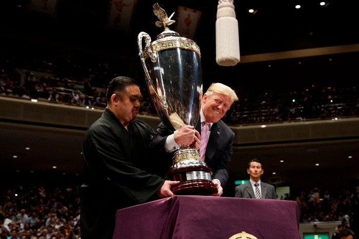 El presidente estadounidense Donald Trump asistió este domingo a una competición de sumo en Tokio e incluso subió a la arena de Ryogoku Kokugikan para entregar un premio, desatando los gritos entusiastas del público.Trump, quien con esta visita a Japón ha sido el primer líder extranjero que se reunió con el nuevo emperador Naruhito, llegó al estadio este domingo sonriendo y con el puño en alto para saludar a más de 10 mil espectadores.El público de sumo se sienta en cojines en el suelo, pero, protocolo obliga, el primer ministro japonés Shinzo Abe y su esposa Akie --que llevaron a Trump y a su esposa Melania a la competición-- hicieron preparar cuatro sillas.A la llegada de Trump la multitud pareció olvidarse por un rato del deporte y todas las miradas --y miles de teléfonos celulares-- convergieron sobre el visitante y su esposa para filmar el acontecimiento.Pero, aficionados al sumo por sobre todas las cosas, luego de unos minutos la acción se reinició en la arena y todo el mundo pareció olvidar al presidente extranjero, al menos por un rato. Mientras los colosos se acuclillaban y se embestían, el público pasaba según las incidencias de la angustia a los gritos de júbilo y de regreso al suspenso.El presidente estadounidense pareció sorprendido por la feroz y hercúlea lucha, que a menudo solo duraba unos segundos.Su larga experiencia como espectador y promotor de la lucha profesional estadounidense fueron de poca ayuda para Trump. Su aire jovial lo abandonó y, con la excepción de algunas palabras intercambiadas con su esposa o el primer ministro Abe, permaneció congelado, mirando al frente.El luchador japonés Asanoyama perdió su última pelea, pero tenía la ventaja suficiente para obtener el título de campeón.Asanoyama volvió a la arena para recibir la copa de los organizadores. Luego Abe le ofreció otro trofeo --aun más grande--, y finalmente fue el turno del visitante quien entregó una copa todavía de mayor volumen llamada "Copa del Presidente", pero ya rebautizada como la "Copa Trump".Este trofeo llegó a la arena bajo un lienzo blanco y una vez en el centro fue descubierta por un responsable del torneo vestido de forma tradicional.Plateada, con grandes asas un águila en la parte superior, el trofeo generó exclamaciones de admiración de los espectadores.Trump, una vez en la arena para entregar el trofeo, leyó una corta presentación y fue aplaudido cuando anunció la fecha a la manera japonesa: "26 de mayo, año 1 de la era Reiwa".Luego hizo las delicias de los fotoperiodistas cuando al alzar la copa ayudado por un funcionario de la organización, hizo gestos de dolor como si el peso del trofeo estuviese a punto de romperle la espalda.Y en medio de los aplausos, Trump estrecho la mano del campeón, de su anfitrión Abe y rápidamente la pequeña comitiva abandonó el sitio, dejando al competidor Asanoyama solo en el centro de la arena disfrutando su gloria.En realidad casi solo. Porque Trump no pudo con su genio y a medio camino se detuvo todavía algunos segundos para saborear el ambiente: él, el campeón, el centro de atención, la multitud.IM