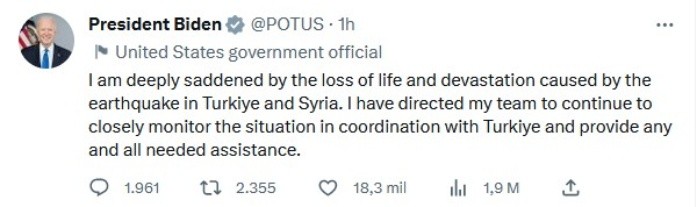 El presidente estadounidense, Joe Biden, lamentó este lunes el terremoto ocurrido en Turquía, que ha afectado también a Siria y ha dejado miles de muertos, y ofreció toda la ayuda necesaria a estos países."Estoy profundamente entristecido por la pérdida de vidas y la devastación causada por el terremoto en Turquía y Siria. He ordenado a mi equipo que continúe monitoreando de cerca la situación en coordinación con Turquía y brinde toda la asistencia necesaria", apuntó el mandatario a través de un mensaje en redes sociales.El fuerte terremoto de magnitud 7.7 sacudió Turquía y Siria la madrugada de este lunes, y ha dejado al menos mil 800 muertos y miles de heridos y desaparecidos en ambos países.A través de un comunicado, el asesor de Seguridad Nacional, Jake Sullivan, apuntó que Estados Unidos está "profundamente preocupado por los informes del destructivo terremoto" y que el país norteamericano está dispuesto a ofrecer "toda la asistencia necesaria"."El presidente Biden ordenó a la Agencia de los Estados Unidos para el Desarrollo Internacional (USAID, en inglés) y otros socios del Gobierno federal que evalúen las opciones de respuesta de EU para ayudar a los más afectados. Continuaremos monitoreando de cerca la situación en coordinación con el Gobierno de Turquía", agregó.JM