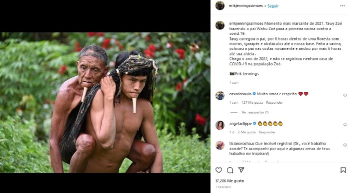 Un habitante de una aldea en la selva del Amazonas, Tawy Zoé, demostró el inmenso amor que le tiene a su padre, pues no le importó la distancia y lo cargó durante seis horas para que recibiera su primera dosis de vacuna contra el COVI-19.Tawy cargó a su padre Wahu Zoé durante 6 horas dentro de un bosque con colinas, arroyos y obstáculos hasta donde se encontraba la base de vacunación.Después de que el señor, quien es mayor de edad, fue inoculado, Tawy volvió a poner a su padre sobre su espalda y caminó otras 6 horas hasta regresar a su aldea.El emotivo suceso fue captado por el neurocirujano y experto en salud indígena en la Amazonía Erik Jennings, quien publicó la imagen de Tawy cargando en la espalda a su padre.La publicación de Jennings obtuvo más de 17 mil "me gusta! así como decenas de comentarios de aprobación por este acto de amor. Así mismo, la historia de Tawy se hizo rápidamente viral y fue compartida por diversos medios.Además, Jennings señaló en la imagen que hasta la fecha no se ha registrado ningún caso de COVID-19 en la población de Zoé.jb