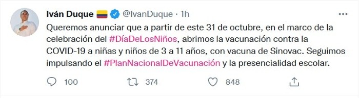 Colombia vacunará a menores de entre tres y 11 años contra COVID-19 desde el 31 de octubre, informó el viernes el presidente Iván Duque. Era el último grupo etario que restaba por ingresar al plan de inmunización.Los niños y niñas serán vacunados con las dos dosis de la farmacéutica Sinovac, explicó el mandatario a través de Twitter.Las dosis de Sinovac fueron avaladas para ser administradas en menores a partir de los seis años de edad por el Instituto Nacional de Vigilancia de Medicamentos y Alimentos (Invima), la autoridad colombiana en esta materia.Este permiso fue dado "por los antecedentes del amplio uso de la vacuna SARS- COV-2 (Célula Vero), Inactivada – Coronavac en niños de tres a 17 años en China, y de seis a 17 años en Chile entre otros países, sin que hayan surgido alertas de seguridad", indicó el Invima el 22 de octubre en un comunicado.El ministro de Salud, Fernando Ruiz, explicó que para avalar la vacunación tuvieron en cuenta el consenso de expertos integrado por las sociedades científicas colombianas. "Este es el regalo más importante que se da a los niños del país para protegerlos, reducir el contagio a sus familias y lograr temas tan importantes como su regreso seguro a las aulas de clase", dijo Ruiz el viernes en una declaración oficial.El gobierno espera vacunar a 7.1 millones de niños que están en ese rango de edad.JM