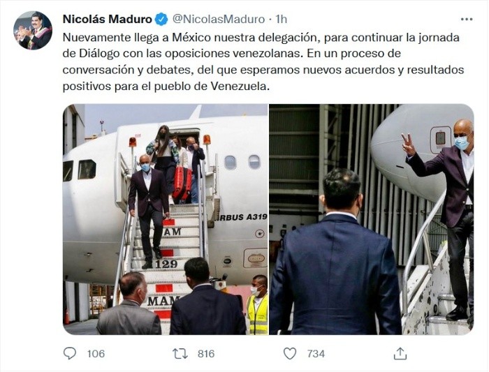 La delegación del presidente de Venezuela, Nicolás Maduro, llegó la tarde de este sábado a la Ciudad de México para la tercera ronda de negociaciones con la oposición, informó Jorge Rodríguez, líder del parlamento venezolano."Hemos llegado a la bella y hospitalaria tierra mexicana para defender la verdad y la dignidad de Venezuela. Esperen noticias nuestras", escribió en Twitter Rodríguez, jefe de la delegación oficialista."Nuevamente llega a México nuestra delegación, para continuar la jornada de Diálogo con las oposiciones venezolanas (...) esperamos nuevos acuerdos y resultados positivos para el pueblo de Venezuela", escribió Maduro en Twitter.El inicio de la tercera ronda estaba programado para este viernes, pero ningún integrante de la delegación oficial se presentó en Ciudad de México."Ante la ausencia de la delegación del régimen (de Maduro) el día de hoy, la delegación de la Plataforma Unitaria reitera su compromiso de avanzar en este proceso", expresaron los negociadores de la oposición, que sí habían asistido al hotel donde estaba pautado el encuentro, en un comunicado divulgado el viernes en Twitter por su principal vocero, Gerardo Blyde.Hasta el momento Blyde no se ha expresado sobre la llegada de Rodríguez a México.En la negociación, el chavismo pide el levantamiento de las sanciones contra Venezuela y el reconocimiento de Maduro, cuya reelección en 2018 es denunciada como un fraude por sus adversarios.La oposición busca un cronograma electoral que incluya nuevas presidenciales.Si te interesó esta noticia y quieres saber más, entonces descarga y descubre INFORMAPlus, la aplicación digital de EL INFORMADOR, en donde tenemos contenidos exclusivos, seleccionados por nuestros editores, para darles una experiencia más completa a los lectores. Si eres suscriptor de EL INFORMADOR tu acceso está incluido, solicítalo al 33 3678-7777.Descarga la aplicación y pruébala GRATIS por treinta días.Para iOS: https://apple.co/35jaVgbPara Android: https://bit.ly/3gwVSEVJM