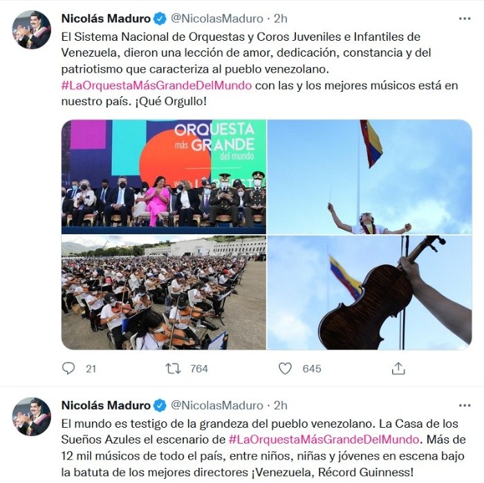 Unos 12 mil músicos venezolanos interpretaron este sábado la Marcha Eslava de Tchaikovsky en un intento por imponer un nuevo récord Guinness a "la orquesta más grande del mundo", cuyo desenlace se conocerá en los próximos días.En el patio de la Academia Militar de Venezuela, en Caracas, se congregaron músicos de todas partes del país, integrantes del Sistema de Orquestas Infantiles y Juveniles de Venezuela, un programa estatal fundado en 1975 por el fallecido maestro José Antonio Abreu que ha dado acceso a educación musical a millares de niños de clases populares."El Sistema", como se le conoce y que ha sido replicado por decenas de países, es cuna de emblemas como Gustavo Dudamel, el director musical de la Ópera de París y la Filarmónica de Los Ángeles.La obra de Piotr Ilich Tchaikovsky, compuesta en 1876 como himno para inspirar a los soldados rusos y serbios en la guerra con Turquía, fue tercera en el programa de ocho piezas en este concierto.Andrés David Ascanio, de 34 años, fue el encargado de dirigir la pieza."Si se les rompe una cuerda, no paren. Si se les va la partitura, sigan de memoria, pero no paren", pidió el maestro antes de finalizar el ensayo para no poner en riesgo el récord.Con la Orquesta Sinfónica Simón Bolívar, la más importante del país, a sus pies y como base, Ascanio levantó la batuta y comenzó a sonar la música.Durante los 12 minutos que dura la pieza, unos 260 auditores de la firma KPMG observaron que cada músico cumpliera las reglas para imponer el récord, como que no se compartan instrumentos y que todos toquen al menos por cinco minutos.Guinness anunciará en los próximos 10 días si Venezuela tiene en definitiva la orquesta más grande del mundo.El récord actual fue impuesto en 2019 en San Petersburgo, Rusia, por una orquesta de ocho mil 097 músicos.JM