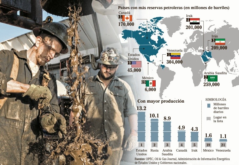 De acuerdo con el informe anual de la OPEP, Venezuela posee más de 303 billones de barriles de petróleo, seguida por Arabia Saudita con 267 billones. Sin embargo, el país sudamericano produce apenas 921 barriles diarios, comparado con los ocho mil 955 de Arabia Saudita.