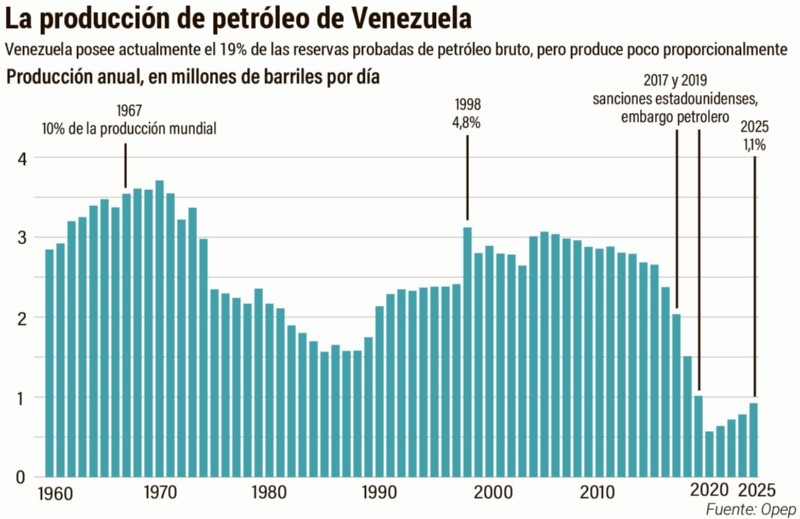 La paradoja venezolana es que, pese a su abundancia, la producción se mantiene deprimida. En su mejor momento, el país bombeó 3.1 millones de barriles diarios, pero en 2025 promedió alrededor de 1.1 millones, afectado por el deterioro de infraestructura, la falta de inversión y las sanciones. Buena parte del crudo se concentra en la Faja Petrolífera del Orinoco, un yacimiento de crudo pesado cuya extracción es más compleja y costosa, pero que sigue siendo la mayor reserva del planeta.
