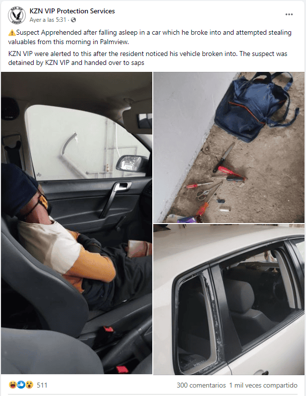Un hombre señalado por intento de robo al interior de un vehículo de un residente de Palmview, un vecindario en la comunidad de Phoenix (Sudáfrica), fue detenido este lunes 14 de marzo a bordo del automóvil debido a que decidió que este era el mejor lugar para tomar una siesta y cuyas imágenes comienzan a adquirir un carácter viral.En la publicación en Facebook que la compañía de seguridad KZN VIP Protection Services compartió, el sospechoso aparece recostado en el asiento del copiloto dormitando en una de las fotografías, mientras que el resto de imágenes se muestran algunas herramientas utilizadas por el detenido y los daños ocasionados al vehículo para ingresar a este."Sospechoso detenido después de quedarse dormido en el auto al que irrumpió y del que intentó robar algunos valores esta mañana en Palmview", señaló la empresa. "KZN VIP fue alertada luego de que el residente notó que su vehículo estaba dañado", continuó.La serie de fotografías en la publicación rápidamente comenzaron a recibir reacciones de los internautas, cuestionando la capacidad que el señalado tenía para quedarse dormido incluso en momentos así, otros dirigieron algunos comentarios de humor al propietario y al fabricante de automóviles.Hasta el momento no se han dado a conocer detalles sobre el costo de los daños, ni la situación legal que enfrenta el hombre detenido por tomar una siesta en el automóvil del que pretendía sustraer algunos artículos.