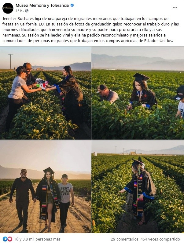 Jennifer Rocha es hija de una pareja de migrantes mexicanos que trabajan en los campos de fresa California, en Estados Unidos, y decidió hacer algo muy original para recordar su graduación: hizo una sesión fotográfica en el sembradío donde trabajan sus padres posando con ellos, acto que se hizo viral y acaparó la atención de muchos.La publicación fue compartida por el Museo de la Memoria y Tolerancia en su cuenta de Facebook. En una de las imágenes se observa a Jennifer entregando a sus padres un reconocimiento que reza: "Gracias a mis padres soy chingona y con diploma", junto a una Bandera mexicana.En otras imágenes, se observa a la joven pizcando chiles junto a sus padres mientras usa una toga, birrete, zapatillas y una banda de la clase 2021. En la última de las fotografías, se observa a los padres e hija tomados de la mano, sonrientes, caminando en el campo de siembra. Según la publicación, Jennifer Rocha "quiso reconocer el trabajo duro y las enormes dificultades que han vencido su madre y su padre para procurarla a ella y a sus hermanas".Hasta el momento, la publicación tiene casi cuatro mil reacciones y los usuarios han felicitado a Jennifer al tiempo que reconocen el trabajo de sus padres y la originalidad de la celebración.OA