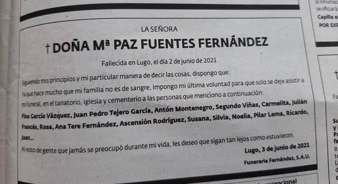 Una curiosa esquela apareció entre las páginas de un diario de Lugo (España), en la que además de notificar el sensible fallecimiento de una mujer, incluía una rigurosa lista de las personas que tenían el derecho a participar en los servicios en su honor, así como un contundente mensaje dirigido a sus familiares.La esquela informaba que la señora Doña Ma. Paz Fuentes Fernández, había fallecido en Lugo, el pasado 2 de junio de 2021 y venía acompañada del siguiente mensaje por parte de la finada:“Siguiendo mis principios y mi particular manera de decir las cosas, dispongo que: Ya que hace mucho que mi familia no es de sangre, impongo mi última voluntad para que solo se deje asistir a mi funeral, en el tanatorio, iglesia y cementerio a las personas que menciono a continuación”.A lo anterior le sigue una lista conformada por 15 nombres resaltados y un remate con el que hace énfasis en las personas a las que no les permitiría ser parte de su despedida: “Al resto de gente que jamás se preocupó durante mi vida, les deseo que sigan tan lejos como estuvieron”.La inserción pagada por los servicios funerarios en el diario, fechada el día 3 de junio de 2021, rápidamente se volvió viral en las redes sociales, en donde internautas reconocían la creatividad y claras convicciones de la mujer con respecto a quienes consideraba como su verdadera familia.