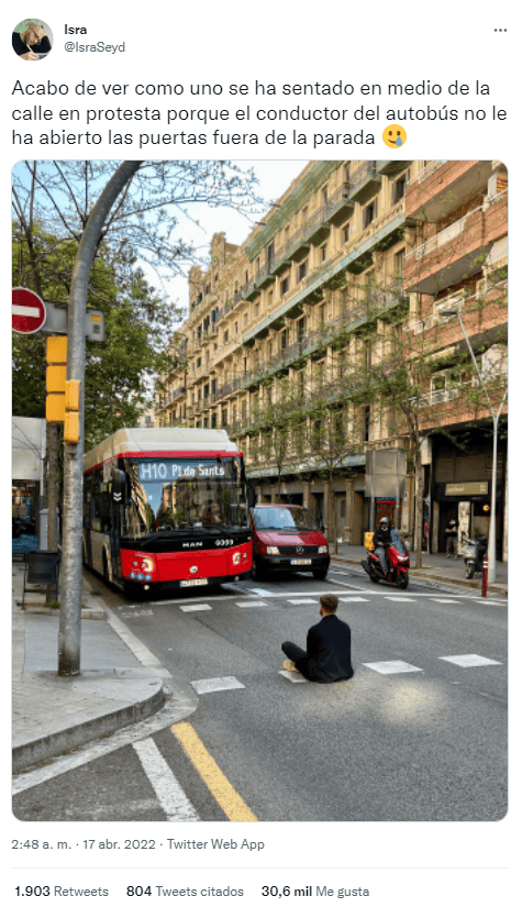 La publicación de una fotografía en Twitter el pasado 17 de abril de 2022 sobre un hecho ocurrido en calles de Barcelona (España), en donde un usuario del transporte público se manifestó intentando bloquear el paso de un autobús que le impidió subir debido a que había solicitado abordar en una zona no permitida, se volvió viral.“Acabo de ver como uno se ha sentado en medio de la calle en protesta porque el conductor del autobús no le ha abierto las puertas fuera de la parada”, comparte el usuario @IsraSeyd junto a la fotografía de un hombre sentado en el asfalto frente a un autobús de la línea H10 Pl- Sants/Olímpic de Badalona en Barcelona. “El conductor le ha hecho una foto y en cuanto ha podido ha cambiado de carril y ya está. La performance”, concluye.Sin embargo, tras volverse viral dicha imagen una segunda perspectiva del hecho rápidamente apareció entre la conversación a la que se sumó el operador del autobús y quien compartió la fotografía captada a bordo mientras esperaba a que el usuario se retirara o encontrara la manera de maniobrar para continuar con su ruta sin poner en riesgo al hombre que impedía su paso.“Yo soy el conductor”, responde el usuario @buspilotbcn y comparte la fotografía desde su perspectiva; en ella se ve al joven sentado sobre el paso peatonal al frente de la unidad. Un transeúnte junto a su mascota también es captado en esta instantánea y lo que parece ser un conductor curioso que también presencia la escena. Es precisamente el hombre que pasea con su mascota quien captó la primera fotografía y quien responde “Jaja, y yo soy el del perro”.Pese a lo curioso e incluso divertido de la situación, algunos usuarios cuestionaron los motivos por los que el joven usuario reaccionó así ante la falta de empatía del operador y compartieron algunas experiencias personales con el transporte público.Un internauta rescató el testimonio de un pasajero que una vez evitó que una tragedia ocurriera luego de que una mujer cayera muy cerca de las llantas por intentar alcanzar la unidad que le había negado el ascenso: “La preocupación de la mujer fue que llegaba tarde; en ningún momento comentó la desgracia que hubiese podido ocurrir por su culpa”, comparte.RG