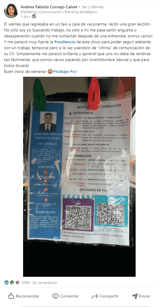 La resiliencia se ha convertido en una habilidad esencial durante la pandemia de COVID-19, particularmente en el mercado laboral en donde las oportunidades se han vuelto escasas para algunos, como el caso de un hombre que no se da por vencido en su búsqueda y ha despertado su creatividad a bordo del taxi que conduce en Lima (Perú).La historia de Jean Cristhopher Pantigoso se hizo viral este lunes gracias a una publicación que Andrea Cornejo compartió en LinkedIn, en donde explicó que el pasado viernes regresaba de su cita a vacunarse y al abordar un taxi se percató que el conductor exhibía en el asiento trasero su currículum.“El viernes que regresaba en un taxi a casa de vacunarme, recibí una gran lección. No sólo soy yo buscando trabajo, no solo a mí me pasa sentir angustia o desesperación cuando no me contactan después de una entrevista, ¡somos varios!”, recalcó en una publicación; “Y me pareció muy fuerte la #resiliencia de este chico para poder seguir adelante con un trabajo temporal pero a la vez usándolo de “vitrina” de comunicación de su CV”, compartía junto a la fotografía del documento.En el documento, Pantigoso da a conocer que tiene amplia experiencia como Asistente Administrativo en diversas compañías y que es egresado de la Universidad San Ignacio de Loyola como licenciado en Administración de Empresas, Marketing y Gestión Comercial.De inmediato su publicación comenzó a llenarse de reacciones y comentarios reconociendo que pese a lo complicadas de sus circunstancias, este tipo de acciones resultan refrescantes como una oportunidad de demostrar la empatía y contribuir a que los demás también accedan a un trabajo acorde a sus aptitudes. Entre los comentarios destacan los de otros usuarios pidiéndole ponerse en contacto para analizar diversas oportunidades laborales, tanto para ella como para Jean.Sigue leyendo…Si te interesó esta noticia y quieres saber más, entonces descarga y descubre INFORMAPlus, la aplicación digital de EL INFORMADOR, en donde tenemos contenidos exclusivos, seleccionados por nuestros editores, para darles una experiencia más completa a los lectores.Descarga la aplicación y pruébala GRATIS por treinta días.Para iOS: https://apple.co/35jaVgbPara Android: https://bit.ly/3gwVSEVSi eres suscriptor de EL INFORMADOR tu acceso está incluido, solicítalo al 33 3678-7777