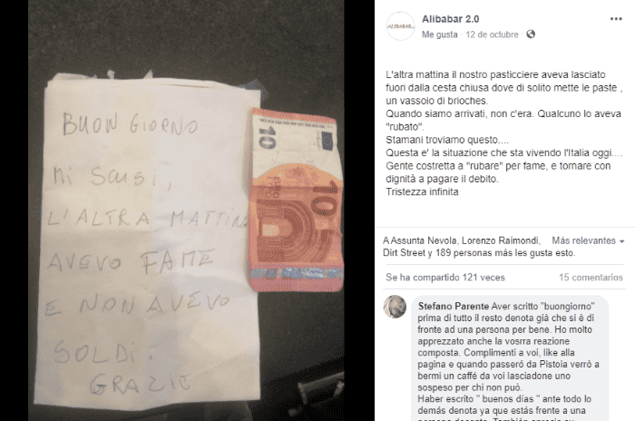 Una cafetería en la Toscana (Italia) compartió el digno desenlace que tuvo hace unos días el robo de un pan, dando muestra de las complejidades económicas de algunos, pero también de su buena voluntad, pues la persona que hurtó la pieza saldó su deuda y dejó un mensaje de disculpas que se ha vuelto viral.Según da a conocer Alibabar 2.0 en su página de Facebook el pasado 12 de octubre, hacía unos días uno de sus panaderos había dejado una bandeja de brioches sobre uno de sus cestos, que alguien había “robado”; sin embargo, la persona responsable del delito, regresó posteriormente y dejó en claro que sus intenciones no eran malas.En la fotografía con la que el establecimiento acompaña su publicación, aparece un billete de diez euros junto a una nota en la que se lee lo siguiente: “Buenos días. Disculpe la otra mañana tenía hambre y no tenía dinero, gracias”.La panadería, lejos de recriminar, expresó su empatía con la persona afectada: “Esta es la situación que vive Italia hoy... personas obligadas a "robar" por hambre, y regresar con dignidad para pagar la deuda. Tristeza infinita”, concluye en su publicación, a la que los usuarios también suman su empatía y lamentan que se trate de circunstancias por las que muchos atraviesan actualmente, aunque no todos puedan saldar su deuda.El negocio además publicó en un medio local una oferta laboral destinada exclusivamente a la persona que dejó la nota con la esperanza de mitigar su situación económica, aunque hasta la fecha no se han revelado mayores detalles sobre el desenlace de esta historia.