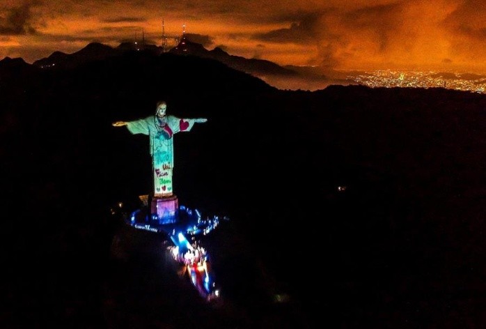 La Iglesia católica brasileña rindió el Domingo de Pascua un homenaje al personal que trabaja en los hospitales en plena pandemia de coronavirus y "vistió" de médico al Cristo Redentor que corona el cerro Corcovado en Río de Janeiro.Con las iglesias cerradas por las restricciones a la circulación de personas impuestas por las autoridades locales para contener la expansión de la pandemia, el cardenal Orani Tempesta realizó una ceremonia casi solitaria a los pies del Cristo, a 709 metros sobre el nivel del mar y con una vista privilegiada de toda la ciudad.Sobre la estatua que representa a Cristo con los brazos abiertos, de 38 metros de altura y que fue inaugurada en 1931, se proyectaron imágenes con banderas de los países afectados por la pandemia, como China, Estados Unidos, España, Italia y el propio Brasil, y mensajes escritos por niños en los que se leía "todo va a estar bien".Finalmente, se proyectó una imagen que "vistió" al Cristo con una bata propia de médicos o enfermeros, en homenaje al personal que trabaja en los hospitales y arriesga su propia vida en la primera línea del combate al coronavirus.Sobre la bata, aparecieron las palabras "gracias" y "esperanza", escritas en varios idiomas, y finalmente la frase "Quédense en casa, por nosotros, por todos. Estamos juntos".Unas horas antes de la ceremonia en el Corcovado, el rector del Santuario del Cristo Redentor, Omar Raposo, lanzó una bendición a los habitantes de Río de Janeiro desde un helicóptero en el que sobrevoló la ciudad durante alrededor de una hora.JM