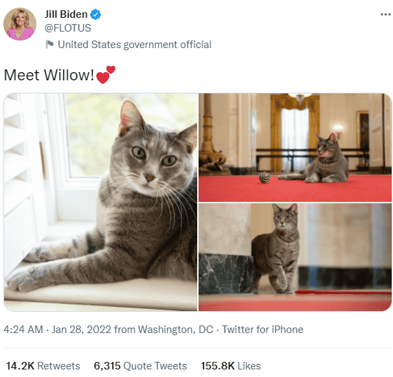 Los Biden suman una vez más un nuevo miembro a su familia. Esta vez se trata de "Willow", una tierna gata de granja, con pelaje gris y blanco. La nueva mascota del presidente de los Estados Unidos, Joe Biden, y la primera dama Jill Biden, tiene dos años de edad y unos llamativos ojos verdes."Willow se está adaptando a la Casa Blanca con sus juguetes y premios favoritos y mucho espacio para olfatear y explorar", mencionó el vocero de la primera dama Michael LaRosa.El nombre de "Willow" fue puesto por Jill Biden, en honor a Willow Grove, Pensilvania, el lugar donde la primera dama pasó sus primeros años de vida.La llegada de "Willow" a la Casa Blanca marca un hito histórico, ya que en la residencia presidencial no se había tenido un felino de mascota desde "India", la gata del ex presidente George W. Bush."Willow" conquistó a los Biden tras interrumpir un discurso saltando al escenario en un acto de campaña en 2020 en Pensilvania, señaló de LaRosa."Willow" se suma a "Commander", el pastor alemán recién agregado a la familia presidencial en diciembre. Obsequio de cumpleaños a Joe Biden, por su hermano James Biden y su esposa Sara.AF