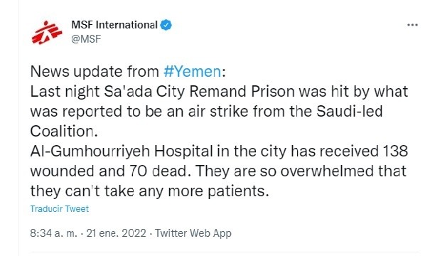Aproximadamente 70 personas fueron asesinadas y al menos un centenar resultaron heridas tras un bombardeo contra una cárcel controlada por rebeldes en Yemen; el ataque que se realizó este viernes y es atribuido a la coalición liderada por Arabia Saudita.Apenas unas horas antes del ataque, la coalición se adjudicó un bombardeo en la ciudad de Hodeida que cobró la vida tres niños.Arabia Saudita lidera una coalición militar que se hizo entre países musulmanes como Emiratos Árabes Unidos, esta formación apoya a las fuerzas gubernamentales yemeníes que luchan contra los rebeldes hutíes, a quienes respalda Irán.Según la ONG Médicos Sin Fronteras (MSF), en medio de la noche un ataque aéreo alcanzó una prisión en Sa'ada, fortaleza de los hutíes encontrada al norte de Yemen, en el ataque murieron 70 personas y al menos 138 resultaron heridas. Los datos que se tienen solo hacen referencia a los pacientes que se encaminaron a hospitales de Sa'ada, ya que "otros dos establecimientos han recibido numerosos heridos".Un portavoz de MSF declaró que "todavía se están realizando búsquedas entre los escombros de la prisión" por lo que la cantidad de víctimas puede ser mayor.Los datos que recopilaron ocho ONG, entre ellas Acción contra el Hambre, Oxfam y Save the Children, se unieron en un comunicado donde se señaló que entre los fallecidos hubo migrantes, además se denunció la "evidente indiferencia" hacia la vida de los civiles.Aunque la coalición no han dicho nada respecto al ataque, los hutíes les acusan de haber ejecutado el “crimen” en Sa'ada.DO