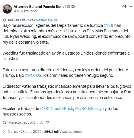 El exatleta olímpico canadiense Ryan Wedding, uno de los traficantes más buscados de Estados Unidos y que ha sido comparado con Joaquín "El Chapo" Guzmán, fue detenido este viernes 23 de enero, de acuerdo con la cadena de televisión estadounidense NBC News.El medio no señaló dónde se produjo la detención de Wedding, pero las autoridades estadounidenses creían que estaba escondido en México, protegido por el Cártel de Sinaloa.Momentos después, el secretario de Seguridad Pública y Protección Ciudadana de México, Omar García Harfuch, informó en sus redes sociales que ayer se tuvo en el país la visita del Director del FBI, Kash Patel, quien hoy viajó a Estados Unidos llevando consigo a dos de los objetivos prioritarios, entre ellos "una persona no estadounidense que fue detenida por autoridades mexicanas de los 10 más buscados por el FBI y un ciudadano canadiense que se entregó voluntariamente ayer en la Embajada de los Estados Unidos", sin precisar que se tratara del exatleta.En sus redes sociales, la fiscal general de Estados Unidos, Pam Bondi, dijo que Wedding fue trasladado en avión a Estados Unidos, donde enfrentará la justicia.Bondi también resaltó que la detención es "un resultado directo del liderazgo en ley y orden del presidente Trump. Bajo @POTUS, los criminales no tienen refugio seguro".Para cerrar, señaló que "el director Patel ha trabajado incansablemente para llevar a los fugitivos ante la justicia. Estamos agradecidos a nuestro increíble embajador Ron Johnson y a las autoridades mexicanas por asistirnos en este caso".Ryan Wedding, de 44 años, representó a Canadá en los Juegos Olímpicos de Invierno de 2002 en Salt Lake City (Utah, Estados Unidos) en la modalidad de snowboard.Sin embargo, años después, era buscado por el FBI por cargos de dirigir una organización transnacional de tráfico de drogas responsable de importar alrededor de 60 toneladas de cocaína al año a Los Ángeles a través de camiones semirremolque desde México, dijo anteriormente la fiscal general, Pam Bondi, en una conferencia de prensa hace algunos meses.Por su parte, el director del FBI, Kash Patel, había comparado a Wedding con el fallecido narcotraficante colombiano Pablo Escobar y el mexicano Joaquín "El Chapo" Guzmán, líder del Cártel de Sinaloa en nuestro país.En marzo de 2025, Wedding fue agregado a la lista de los "Diez más buscados" del FBI y había una recompensa de 15 millones de dólares por información que condujera a su arresto o procesamiento. Las autoridades mexicanas incautaron en 2025 docenas de motocicletas con un valor estimado de 40 millones de dólares, que se creía eran propiedad de Wedding. También incautaron dos medallas olímpicas, dos vehículos, estupefacientes, obras de arte y otros artículos en varios lugares de la Ciudad de México.Se espera que más tarde haya una conferencia de prensa sobre el caso.*Con información de EFE y SUN*Mantente al día con las noticias, únete a nuestro canal de WhatsAppOF
