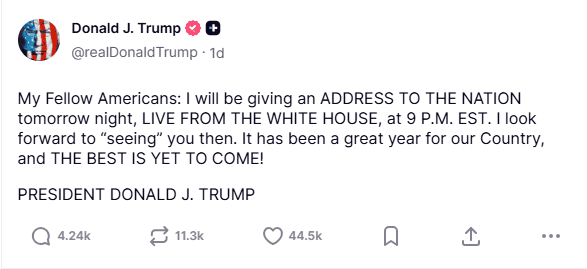 "¡Lo mejor está por llegar!" aseguró Trump en el mensaje que publicó el martes en Truth Social para anunciar este discurso, 11 meses después de regresar al poder.