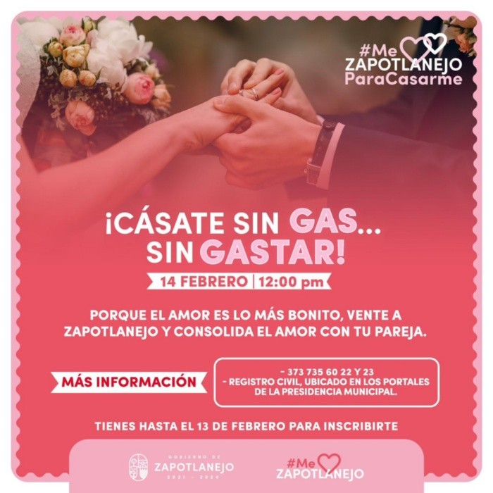 El Gobierno de Zapotlanejo invita a quienes desean unir sus vidas en matrimonio civil a que lo realicen en la capital de la moda de Jalisco; este próximo 14 de febrero el trámite no tendrá costo.El presidente de Zapotlanejo, Gonzalo Álvarez Barragán, destacó la iniciativa de bodas civiles colectivas por el Día de San Valentín o Día del Amor y la Amistad.“En Zapotlanejo conmemoramos este mes con mucho amor: el 14 de febrero celebraremos una boda colectiva, donde sin duda, prevalecerá el cariño que se consolidará con el compromiso”, comentó el primer edil.“Lo más bonito será compartir con todas y todos la alegría y emoción de unir sus vidas en matrimonio, porque en Zapotlanejo celebramos con amor”.Los interesados deberán de acudir previamente al Registro Civil, ubicado en los portales de la Presidencia Municipal, para registrarse; la fecha límite es el 13 de febrero.“¡Las y los esperamos! Juntas y juntos haremos de este día especial, algo inolvidable”, destacó Álvarez Barragán.Para mayor información, pueden comunicarse al 373 735 60 22 y 23.JM