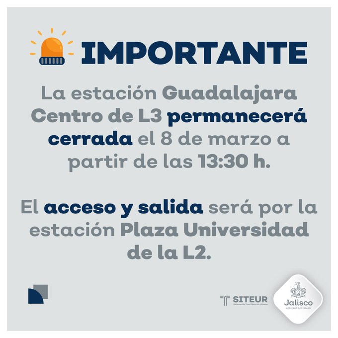 Este 8 de marzo, Guadalajara será testigo de la marcha multitudinaria en conmemoración al Día Internacional de la Mujer, en la que miles y miles de tapatías tomarán las calles de Guadalajara para que la voz se alce en nombre de una lucha que no sólo tiene lugar hoy, sino a diario en las vidas de las mujeres.La marcha del 8 de marzo implicará que haya cambios en la movilidad de Guadalajara, en concreto en Avenida Juárez, Chapultepec, e Hidalgo, siendo sus mayores puntos de concentración la Glorieta de Las y Los Desaparecidos, en Niños Héroes, y en la Plaza Imelda Virgen, en pleno Centro Histórico. El Sistema de Tren Eléctrico Urbano (SITEUR), informó a través de sus redes sociales oficiales que, a causa de la marcha del 8M, la estación Guadalajara Centro, perteneciente a la Línea 3, permanecerá cerrada desde la 1:30 de la tarde hasta nuevo aviso.Esto no implica que se suspenda el servicio de la Línea 3, sino que esta estación en específico no tendrá acceso al público. La entrada y salida de la misma será, en esta ocasión, por la estación Plaza Universidad de la Línea 2, ubicada a un costado, y que tiene acceso directo con Guadalajara Centro, pues es la conexión entre la Línea 2 y 3. Hasta el momento, SITEUR no ha informado si habrá más cambios en sus servicios, pero reitera a la ciudadanía que se mantenga informada en redes sociales ante cualquier actualización imprevista. Hasta ahora, ni el Macrobús, el Trolebús de Hidalgo o el resto de las estaciones del Tren Ligero se verán afectadas. FS