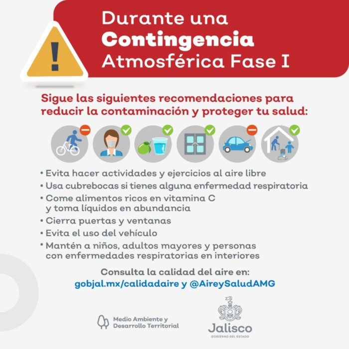 La Secretaría de Medio Ambiente y Desarrollo Territorial (Semadet) activó hoy a las 09:00 horas una contingencia atmosférica fase 1 en la zona de influencia de la estación de monitoreo Las Pintas, en el municipio de El Salto.Lo anterior, debido a que en Las Pintas se registraron niveles mayores a los 150 puntos Imeca (Índice Metropolitano de la Calidad del Aire). A las 09:00 horas se detectaron 153 puntos Imeca y a las 10:00 el nivel máximo fue de 155 puntos.El contaminante registrado son las partículas menores a 10 micras (PM10).Asimismo, continúa la precontingencia atmosférica para la zona de influencia de la estación Santa Fe, en donde se registran 149 puntos Imeca. Ante la mala calidad del aire la Semadet pide a la ciudadanía atender las siguientes recomendaciones:NR