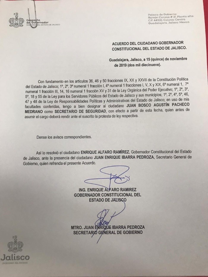 Con base en los fundamentos jurídicos que le faculta la Constitución Política del Estado de Jalisco, el viernes el gobernador Enrique Alfaro designó a Juan Bosco Agustín Pacheco Medrano como secretario de Seguridad.Dicho nombramiento surte efecto a partir de esta fecha, sin embargo, antes de asumir el cargo deberá rendir la protesta de ley respectiva.Juan Bosco Agustín Pacheco Medrano tiene 42 años de edad; es Licenciado en Derecho por la Universidad de Guadalajara.Con una trayectoria de 20 años en las instituciones policiales, formó parte de la Policía de Guadalajara por 17 años, siendo su último cargo el de Comisario General de la corporación en 2017.Recibió el nombramiento de Comisario de la Policía Vial para luego ocupar la posición de Comisario General de la Secretaría de Seguridad del Estado.Fue designado como encargado de despacho de la Secretaria de Seguridad, desde el pasado 04 de octubre hasta el día de hoy.Como parte de su formación profesional, destacan diversos cursos y diplomados en temas tácticos y estratégicos, tanto en el país como en el extranjero.NM