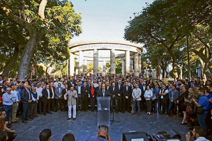 Cobijado por un frente integrado por alcaldes de distintos partidos, empresarios, organismos ciudadanos, dirigentes sindicales, rectores de universidades, así como por diputados locales y federales, el gobernador electo Enrique Alfaro Ramírez, exigió al Presidente electo Andrés Manuel López Obrador, tomar en cuenta las propuestas de Jalisco en el Presupuesto 2019, respetar la soberanía del Estado y castigar a los delincuentes.“Le decimos (al Presidente electo) que aquí en Jalisco no vamos a permitir que se vulnere nuestra soberanía ni mucho menos que se traicione el pacto federal, hacerlo sería tanto como resignarnos a una realidad que pareciera ir tomando forma de controles desde el Centro del país sobre el destino político, financiero, administrativo y de la seguridad de nuestro Estado”.Reconociendo la legitimidad del Presidente electo y ofreciendo el respaldo para apoyar la transformación que impulsa para el país, Enrique Alfaro reclamó ayer al próximo Mandatario federal que los intereses del Estado y de los municipios han sido ignorados en la propuesta del paquete financiero, además de que pidió no modificar las reglas del Ramo 23 para otorgar recursos a las entidades federativas.Con respecto al Plan Nacional de Seguridad recién presentado, refirió que los estados y municipios son los “responsables de la seguridad, por mandato constitucional”, por lo que ve preocupante que los superdelegados vayan a asumir funciones en esta materia, contrario a lo que, aseguró, se acordó en la reunión con la CONAGO.Además de pronunciarse contra el “olvido” a los municipios y el Estado en el Presupuesto de Egresos federal, el gobernador electo, Enrique Alfaro, se manifestó contra la política de “perdón y olvido” a los corruptos que ha manifestado el Presidente electo, Andrés Manuel López Obrador.Dijo que Jalisco ha sido “ejemplo nacional en la lucha contra la impunidad”, gracias al impulso a proyectos como el Sistema Nacional Anticorrupción. “Vamos a castigar a los corruptos, con o sin el aval del Gobierno federal. En Jalisco los corruptos irán a la cárcel, no de vacaciones”.El gobernador electo también se manifestó en contra de que los delegados federales asuman funciones en seguridad pública, lo que considera una “violación directa a la Constitución Política de Jalisco” y una falta de respeto a las autoridades estatales y municipales electas. “No somos ‘invitados’ a la mesa de seguridad; somos los responsables de la seguridad en nuestro Estado”, declaró Alfaro.Miembros de las cúpulas empresariales, educativas y de la sociedad civil respaldaron el pronunciamiento que se hizo en la Rotonda de los Jaliscienses Ilustres, y pidieron que se apoyen los proyectos estratégicos del Estado en el Presupuesto federal, así como respetar la soberanía de Jalisco.“No es posible tolerar y soportar que los proyectos estratégicos para el Estado no se mantengan”, manifestó Mauro Garza Marín, titular en Jalisco de la Confederación Patronal de la República Mexicana (Coparmex).Augusto Chacón, director de Jalisco Cómo Vamos, también se sumó a las voces críticas: “Es jurídicamente inaceptable, un perdón otorgado solamente porque alguien cree que es lo mejor nos puede llevar a un caos”.En reacción al pronunciamiento que hizo el gobernador electo, Enrique Alfaro, en contra de las decisiones federales en materia de Presupuesto y seguridad pública, diversos actores de la sociedad civil y la iniciativa privada consideraron que sería un “retroceso” para la economía de Jalisco la suspensión de recursos para las obras de infraestructura.“Existen proyectos en movilidad, mejora de la red carretera de Jalisco, ampliación del Aeropuerto, inversión en tecnología y educación, y muchos proyectos prioritarios en el Estado. Si no se apoyan, lo que puede suceder es que Jalisco detenga su avance, crezca la desigualdad y la riqueza se siga concentrando en pocas manos”, mencionó Augusto Chacón, director del organismo Jalisco Cómo Vamos.“Hay proyectos estratégicos para nuestro Estado que no se pueden detener. Sabemos que éstos tienen que ser claros y revisarse, pero tienen que seguir. Venir y establecer reglas distintas sin una claridad o una proyección puede ser peligroso”, consideró a su vez Mauro Garza, presidente de la Confederación Patronal de la República Mexicana (Coparmex) Jalisco.Finalmente, el coordinador del Consejo de Cámaras Industriales de Jalisco (CCIJ), Daniel Curiel Rodríguez, sostuvo que hay un “desacuerdo” en la dirección que pretende tomar el nuevo Gobierno, pues pretende destinar más recursos al desarrollo social reduciendo presupuesto para dependencias enfocadas al desarrollo y la promoción económica.“Creo que Jalisco, a pesar de sus carencias, pero donde hay empleo digno y toda la gente está trabajando, no puedes quitar dinero a la promoción económica porque eso promueve el empleo”, señaló.