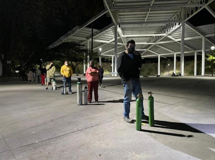 La búsqueda de oxígeno medicinal continúa fuerte en Guadalajara y la Policía tapatía implementó ayer un operativo para resguardar la seguridad de los clientes de un negocio ubicado en avenida R. Michel. El establecimiento recibe hasta mil 500 personas al día. Ante esta situación, Arturo Acosta ofreció otra alternativa: creó “Oxígeno en ruedas” para llevar este producto a diversas zonas de la metrópoli. Él se dedica a este negocio desde hace años. Sin embargo, por el incremento en los contagios decidió equipar una camioneta y mover sus seis tanques grandes para rellenar los pequeños. El lunes se instaló cerca de la glorieta Minerva.“Quisimos hacer un ‘cáliz’ con 150 pesos por tanque y terminamos poniendo de nuestra bolsa. Lo aumentaremos, pero nos mantendremos debajo de los costos del mercado. Queremos llevarlo a comunidades donde no se pueden trasladar”, dijo. “En el primer día llenamos 50, aunque nos faltan detalles como evitar aglomeraciones”, agregó. “Oxígeno en ruedas” tiene una página de internet que en tres días ganó más de 17 mil seguidores. Allí informa dónde se ubicará. Protección Civil y Bomberos Guadalajara revisó las condiciones del vehículo y afirmó que no cuenta con puntos de riesgo (no hay fugas y el embalado de los tanques es correcto). Además, tras verificar la documentación de la compañía, determinó que el producto que ofrece se adquiere de forma segura. A nivel federal, la secretaria de Gobernación, Olga Sánchez Cordero, resaltó que la Comisión Federal de Protección contra Riesgos Sanitarios (Cofepris) busca acortar el tiempo para autorizar permisos de producción y distribución de oxígeno.Con la finalidad de resguardar la seguridad de quienes acuden a abastecer tanques de oxígeno para pacientes graves de COVID-19, la Policía de Guadalajara reforzó la vigilancia en la colonia El Rosario, en el punto ubicado en la avenida R. Michel y Río Tizapan, donde se detectó una afluencia de hasta mil 500 personas al día, según la Comisaría tapatía.Desde hace dos semanas se incrementó el patrullaje tanto a pie como en vehículo, y no sólo en en el punto de reabastecimiento, sino en las calles aledañas.La presencia policíaca, aseveró la dependencia, se mantiene las 24 horas del día, aunque se ha detectado que las personas comienzan a formarse desde las 04:00 y que la zona permanece concurrida hasta las 20:00 horas, cuando cierra la empresa.La corporación recordó a los ciudadanos “la importancia del uso de cubrebocas, además de que es imprescindible lavarse las manos frecuentemente y mantener una distancia de 1.5 metros respecto a otras personas”.Además, reiteró que pueden hacerse reportes directos a la Comisaría al 33-1201-6070, o bien, a la línea 911 si se trata de una emergencia.#ElCoronavirus NoPasaLa Organización Panamericana de la Salud (OPS) señala que si bien es importante tomar agua, ésta no previene la infección por coronavirus. El organismo recomienda consultar a un médico si tiene fiebre, tos o dificultad para respirar.