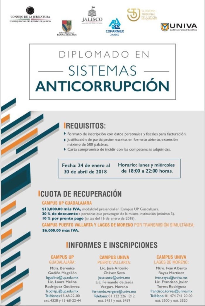 Ricardo Suro Esteves, presidente del Supremo Tribunal de Justicia del Estado de Jalisco (STJEJ) anunció la realización Diplomado en Sistemas Anticorrupción, que realiza en conjunto con Coparmex Jalisco, Gobierno del Estado, Universidad Panamericana y la Universidad del Valle de Atemajac, el curso en Sistemas Anticorrupción, único a nivel nacionalSuro Esteves señaló que “la visión de este Diplomado es la de consolidar al Estado de Jalisco, como referente en la profesionalización en materia de anticorrupción, contando con instituciones, empresas, asociaciones, profesionistas y ciudadanos debidamente capacitados en el tema”.El anuncio del Diplomado se hizo en el marco de la instalación del Comité Coordinador del Sistema Estatal Anticorrupción (SEA), el cual se encargará de marcar las bases y acciones para el combate de la corrupción en el Estado, el Magistrado Suro Esteves, como representante del CJEJ, firmó el acta con la que se formalizó la instalación del comité, junto con los representantes de las instituciones encargadas de sentar las bases y acciones en este combate.La sede donde se impartirá el diplomado será la Universidad Panamericana a partir del 24 de enero y concluye el 30 de abril, con sesiones los lunes y miércoles con un horario de 18:00 a 22:00 horas, los campus en Puerto Vallarta y Lagos de Moreno contarán con trasmisión simultánea de los cursos. Los requisitos de inscripción son: Llenar el formato de admisión y el formato de pago; carta de exposición de motivos para participar en el curso en un máximo de 500 palabras; carta compromiso de incidir con las competencias adquiridas. Más información en el sitio web del Supremo Tribunal de Justicia del Estado de Jalisco y de las UP y UNIVA.LS