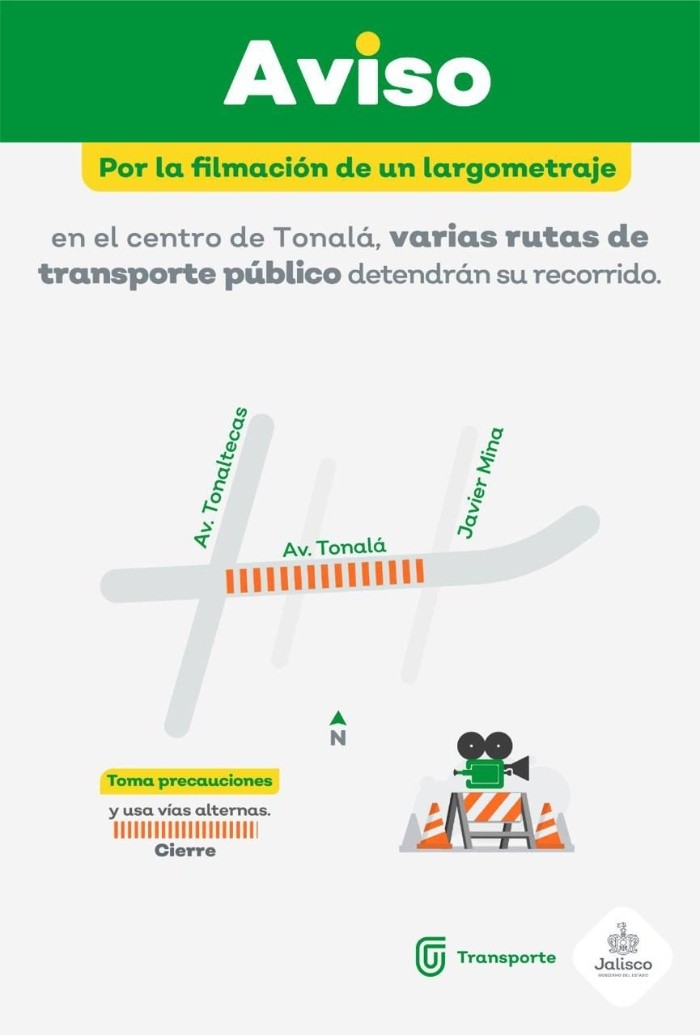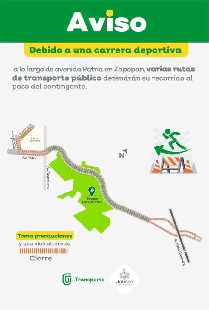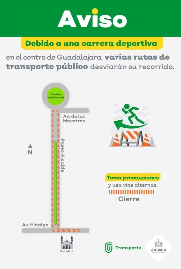 El Gobierno estatal informó que debido a dos carreras deportivas que se realizarán mañana domingo 24 de septiembre en Zapopan y Guadalajara, algunas rutas del transporte público detendrán momentáneamente su recorrido mientras pasa el contingente de corredores.Además, por la filmación de un largometraje en la cabecera municipal de Tonalá, el lunes 25 de septiembre otras rutas del transporte público también modificarán sus recorridos.La Secretaría de Transporte agradece la comprensión e invita a las y los usuarios a planificar con antelación sus traslados, en caso de que usen las rutas mencionadas.La carrera empezará a las 06:30 de la mañana en la glorieta de la escultura de alas “Anhelos” en el boulevard Puerta de Hierro en sentido de la circulación vehicular, al llegar a la avenida Patria girarán a la izquierda, seguirán por la misma vía incorporándose al paso a desnivel, cruzarán la avenida Ávila Camacho, para después regresarse en el siguiente retorno, continuarán por avenida Patria, seguirán por la misma vía, ingresarán al paso a desnivel en Acueducto, llegarán a Paseo Andares donde girarán a la derecha para encontrarse con la meta.Las rutas del transporte público que sufrirán retrasos en su recorrido, serán C43 Arco del Triunfo, C120, C121A, C121B, C136, C140, C54, C71, T17, T17-1 y T17-C01 en avenida Patria por ambos sentidos, entre boulevard Puerta de Hierro y avenida Manuel Ávila Camacho.Por su parte, la carrera en Guadalajara comenzará a las 07:30 de la mañana desde la Av. Hidalgo, a un costado del Palacio Legislativo.Los corredores avanzarán hacia el poniente por la misma vía, darán vuelta a la derecha en la avenida Fray Antonio Alcalde en dirección a la Glorieta de La Normal, en donde se retornarán para continuar por la avenida Fray Antonio Alcalde en dirección a la Catedral de Guadalajara, al llegar a la avenida Hidalgo girarán a la izquierda para encontrarse con la meta.Las rutas del transporte público que detendrán su derrotero en lo que pasan los competidores serán las siguientes:Rutas C16, C21, C43 Haciendas del Valle, C43 Valdepeñas, C64, C65, C69, T14A-C02, T14A-C03, T14A-C04 dos vías, T14B-C02 dos vías, T15, T15-1, T15 Dos Templos, T15-C01, T15-C02, T15-C04, T15-C04 El Quince, T15-C04 Manantial, T15-C05, T15-C06 Dos Templos, T15-C06 Hospital Civil, T15-C06 Mesa Colorada y T16A-C01 en la avenida Fray Antonio Alcalde, de la avenida Hidalgo hacia la avenida Manuel Ávila Camacho en ambos sentidos.Debido a la filmación de un largometraje en la cabecera municipal de Tonalá, el lunes 25 de septiembre algunas rutas del transporte público modificarán sus recorridos.La avenida Tonalá estará cerrada a la circulación de las 5:00 a las 20:00 horas, entre la avenida Tonaltecas y Javier Mina, por lo que las rutas del transporte público que modificarán su recorrido son las siguientes:Las rutas C102, C106, C38-V1, C38-V2, C39-V1,C39-V2 y T11B-C01 Tonalá centro, lo harán en su trayecto de ida, que al circular por la calle Galeana, se desviarán en Anesagasti, después tomarán Ramón Corona, luego la calle Cuauhtémoc, seguirán en Emiliano Zapata, continuarán por avenida Tonaltecas para retomar su ruta en avenida Tonalá.En su trayecto de regreso, al venir por su ruta en avenida Tonalá, se desviarán en avenida Tonaltecas, luego tomarán Zaragoza, después Venustiano Carranza para seguir su recorrido ordinario.La ruta C61 Clínica 93 del IMSS, que va por la calle Galeana, iniciará su desvío en Anasegasti, tomará después Ramón Corona, seguirá en Cuauhtémoc, luego la calle Emiliano Zapata y en avenida Tonaltecas retomará su ruta habitual.En sentido inverso, de circular por avenida Tonaltecas, se desviará en Zaragoza, después tomará la calle Venustiano Carranza y seguirá en Moctezuma su recorrido acostumbrado.Por último, la ruta T06-1 se desviará en Galeana, continuará por Anesagasti, después tomará Ramón Corona, luego la calle Cuauhtémoc, seguirá en Emiliano Zapata para retomar su recorrido en la avenida Tonaltecas.YC