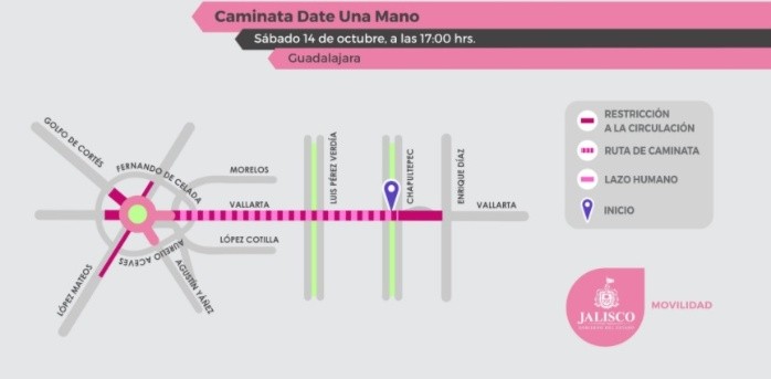 El próximo sábado 14 de octubre serán cerradas varias vías de circulación por la caminata “Date Una Mano” que busca concientizar a las mujeres para realizarse revisiones constantes y prevenir el cáncer de mama.A través de la cuenta de Twitter de la Secretaría de Movilidad, detallaron que el cierre comenzará en la Avenida Enrique Díaz de León y Vallarta, para continuar de esta forma hasta La Minerva. Por lo que las calles de López Mateos y Gofo de Cortés en su altura con Fernando de Celada se mantendrán cerradas.El corte de la circulación iniciará a las 17:00 horas.Tan sólo en Jalisco, durante 2017 se han detectado 542 nuevos casos de cáncer de mama y ha habido 257 fallecimientos por esta causa.Alrededor del 45% de los casos de cáncer de mama a nivel nacional son en mujeres menores de 50 años.