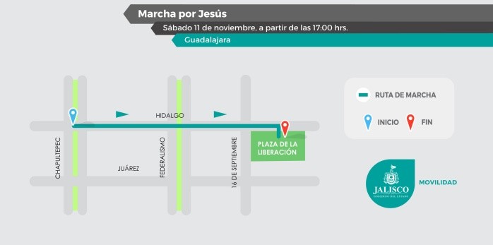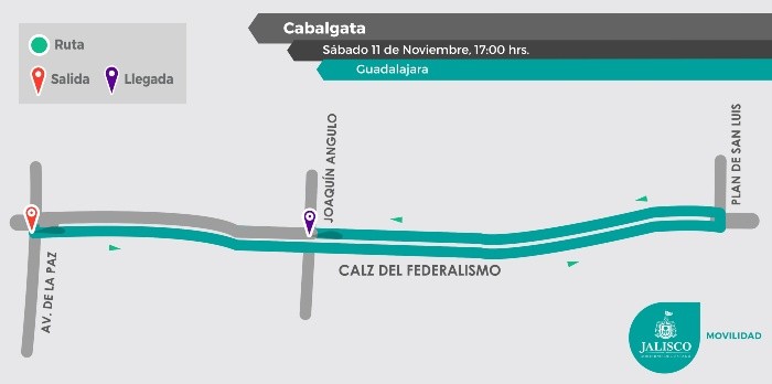 La Secretaría de Movilidad anunció que este sábado 11 de noviembre se verá afectada la circulación en varios puntos de la ciudad por los cierres viales que realizaran por una marcha, una caminata y una procesión – cabalgata.2. Procesión-Cabalgata Religiosa, iniciará su ruta en punto de las 17:00 horas desde la Calzada del Federalismo en su cruce con avenida La Paz de la Zona Centro de Guadalajara. Seguirá por Federalismo al Norte hasta avenida Plan de San Luis, donde retornará en “U” hasta concluir en el Templo de Nuestra Señora del Refugio, ubicado sobre el camellón central de Federalismo en su cruce con la calle Joaquín Angulo.3. Caminata de la Salud, que se llevará a cabo a partir de las 8:00 horas desde el Pórtico del Sindicato Nacional de Trabajadores del Seguro Social en la colonia San Carlos de Guadalajara, y concluirá en el estacionamiento del Centro Médico de Occidente. Las restricciones a la circulación serán en las avenidas Río Nilo, Luis Pérez Verdía, Federico Medrano, Constancia-Aquiles Serdán, Juan Pablo II y Salvador Quevedo y Zubieta.