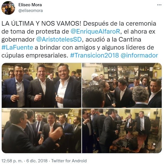 Este sábado 18 de diciembre se cumple un año de la muerte del exgobernador de Jalisco, Jorge Aristóteles Sandoval Díaz, quien fue ejecutado mientras permanecía en un bar de Puerto Vallarta. A un año de su fallecimiento, recordamos la ocasión en la que, al finalizar su administración, el político jalisciense se reunió con sus excolaboradores y amigos en la tradicional cantina "La Fuente" en el Centro Histórico de Guadalajara, para brindar por el trabajo hecho.Aquel 6 de diciembre de 2018, Aristóteles Sandoval acudió a "La Fuente" luego de que el gobernador entrante tomará protesta como titular del Poder Ejecutivo de Jalisco. Ese jueves, Sandoval Díaz brindó con tequila junto a sus amigos y algunos líderes estatales. Se le vio sonriente luego de dejar el cargo que ostentó durante seis años, a la cabeza del Gobierno de Jalisco, y departió sin la responsabilidad de ser autoridad.Un día antes, Aristóteles Sandoval se había despedido a través de sus redes sociales con un video en el que destacaba todos los logros de su administración."A estas alturas, todo está dicho. Sólo hay algo que quisiera que permaneciera en el tiempo y que llegara a cada rincón de Jalisco a unas horas de que este ciclo se cierre: GRACIAS, muchas gracias", escribió Aristóteles en Twitter por aquellos días.Ayer, a un día de que se cumpla un año del asesinato del ex gobernador de Jalisco, Aristóteles Sandoval, la Fiscalía del Estado (FE) presumió avances en el caso y destacó 17 órdenes de aprehensiones, de las cuales ya fueron cumplimentadas 13, esto sin aún tener detenidos a los principales responsables.El documento de la Fiscalía señala que desde que se abrió la carpeta de investigación, desde el 18 de diciembre del 2020, se trabajó en la identificación de los presuntos responsables, logrando identificar a un hombre y una mujer, los que se presumen fueron los autores materiales. Ya hay órdenes de aprehensión contra ellos.Además, señala el boletín, hay cuatro órdenes de aprehensión pendientes por cumplimentar: tres por el delito de homicidio calificado y homicidio en grado de tentativa y una más por encubrimiento, y también se vinculó a una persona más por cohecho, la cual ya está libre.Asimismo, destacan que se han llevado más de 300 colaboraciones solicitadas a las 31 Fiscalías de los estados, así como a la Fiscalía General de la República (FGR) y al fiscal General de Justicia Militar, con la finalidad de realizar la búsqueda y captura de los responsables.La FE ha realizado alrededor de 50 entrevistas de testigos, han llevado a cabo diversos cateos y seguimientos a la investigación.OA