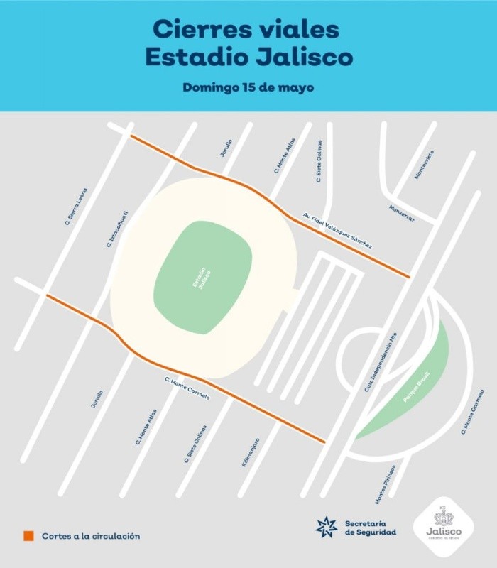 La Comisaría de la Policía Vial de Jalisco aplicará operativo durante el Clásico Tapatío de Atlas contra Chivas este domingo en el Estadio Jalisco. "Se contará con personal motorizado, que apoyará en la coordinación de las acciones para hacer fluida la circulación, además de que realizarán recorridos por las calles aledañas para vigilar el debido cumplimiento de las disposiciones legales".Confirma que se realizarán cierres viales en Fidel Velázquez. de Calzada Independencia a Sierra Leona, así como en entre Monte Carmelo y Fidel Velázquez.Como rutas alternas estarán habilitadas las siguientes calles:Para las personas que acudan al Estadio Jalisco, la Comisaría de la Policía Vial recomienda:Se invita a consultar la información en las redes sociales de la institución; en Facebook: Policía Vial Jalisco, y en Twitter: @JaliscoVial.OF