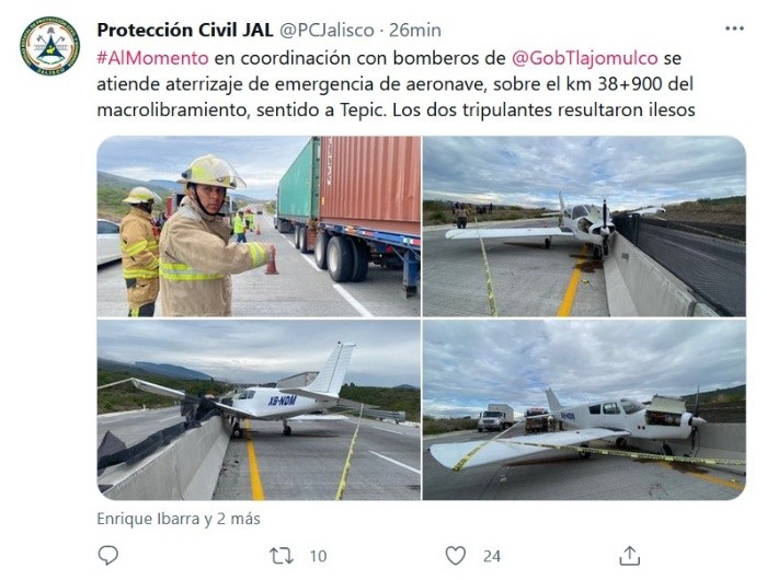 Una avioneta perteneciente a una escuela de aviación tuvo un aterrizaje forzoso la tarde de este miércoles sobre el Macrolibramiento.Los hechos sucedieron alrededor de las 18:00 horas sobre el kilómetro 38+900 de la vía ya mencionada, en sentido al estado de Tepic, informaron las unidades de Protección Civil y Bomberos de Tlajomulco y del Estado, quienes atendieron el percance.De acuerdo con la información preliminar, mientras se encontraba en vuelo, la avioneta Piper PA 28 presentó una descompostura en el motor, por lo cual se procedió a realizar el aterrizaje forzoso.La punta de la avioneta terminó impactada contra el muro de contención del Macrolibramiento; sin embargo, el alumno y su instructor resultaron ilesos. Únicamente se registró el derrame del combustible, que fue saneado por los elementos de Protección Civil.Tras descartar mayores riesgos, el vehículo fue retirado del sitio. Al apoyo acudió también personal de la Aeronáutica Civil y la Guardia Nacional.JM