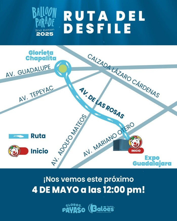 El desfile más grande del mundo, el Balloon Parade 2025 llegará por primera vez a la Perla Tapatía el próximo domingo 4 de mayo como parte de las celebraciones por el 75 aniversario de Globos Payaso.Este año, el desfile más esperado por chicos y grandes llega con una temática que promete deslumbrar: “El fondo del mar”, prepárate para un espectáculo único donde enormes carrozas decoradas completamente con globos darán vida a criaturas marinas y paisajes oceánicos salidos de un sueño.El Balloon Parade 2025 comenzará mañana a partir de las 12:00 hasta las 2:00 pm, por lo que algunas de las principales vialidades de Guadalajara serán cerradas para dar paso al desfile durante dicho horario. De acuerdo con lo informado por Expo Guadalajara en sus redes sociales el desfile tendrá la siguiente ruta el próximo 4 de mayo: saldrá desde la Expo Guadalajara en la Calle Faro, y avanzará sobre Avenida de las Rosas, cruzando por las avenidas Mariano Otero, Adolfo Mateos, Tepeyac y Guadalupe, hasta llegar a la Glorieta Chapalita, para regresar por las mismas vialidades hasta las instalaciones del recinto.NA