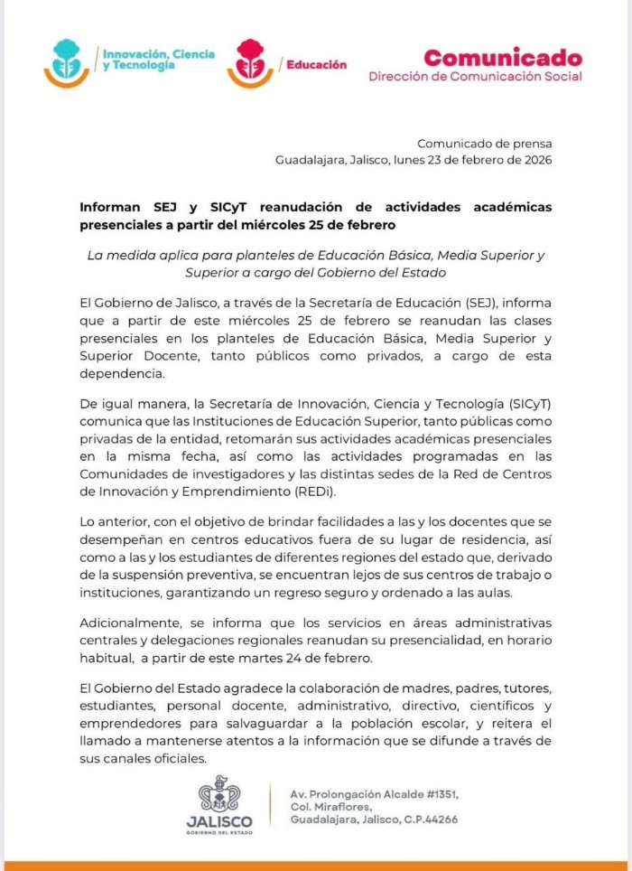 En el ámbito educativo se informó que mañana continuarán suspendidas las clases presenciales en todos los niveles. El gobernador de Jalisco, Pablo Lemus Navarro, anunció que las actividades escolares se reanudarán a partir del miércoles 25 de febrero.
