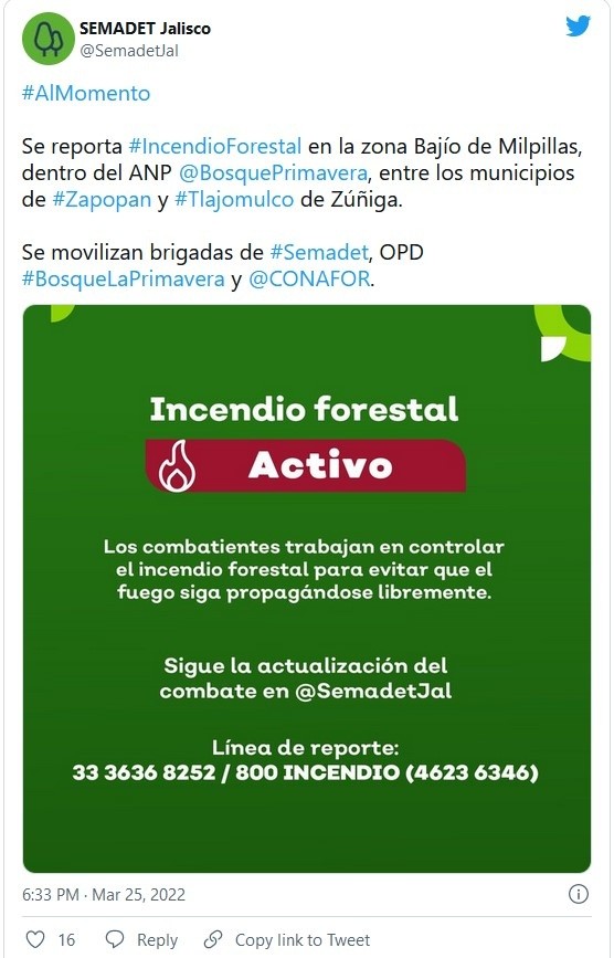 La tarde de este viernes se registró un nuevo incendio en la zona Bajío Las Milpillas, dentro del Área Natural Protegida (ANP) del Bosque La Primavera.El siniestro, reportado a las 18:30 horas, sucedió en la misma zona donde ocurrió el incendio iniciado el pasado miércoles que consumió 280 hectáreas del ANP.Para su combate, informó la Secretaría de Medio Ambiente y Desarrollo Territorial (Semadet), se movilizaron brigadas de combatientes de la misma dependencia, del OPD Bosque La Primavera y de la Comisión Nacional Forestal.Hacia las 19:00 horas el siniestro se reportaba como controlado, es decir, con muy poco riesgo de que el fuego continúe propagándose.Por la mañana se reportó otro incendio en el Bosque La Primavera. De acuerdo con lo señalado por la Semadet, se dio dentro del paraje conocido como El Tizate, sin embargo, este alcanzó a desplazarse al paraje Lomas de la Primavera, dentro del ANP.Hacia las 11:00 horas el siniestro se reportó como controlado, aunque a las 14:30 el fuego se reactivó. A las 16:20 horas la Semadet lo reportó por fin como liquidado, por lo cual se procedió al enfriamiento de la zona.En este incendio, dijo la dependencia, trabajaron elementos de la propia Semadet y del Bosque La Primavera con apoyo también de una motobomba de la Coordinación Municipal de Protección Civil y Bomberos Zapopan.Ayer, luego de que se reportara liquidado el incendio iniciado el miércoles dentro del ANP en zona de Bajío Las Milpillas, en un corte preliminar las autoridades forestales señalaron que la afectación fue de alrededor de 280 hectáreas.JM