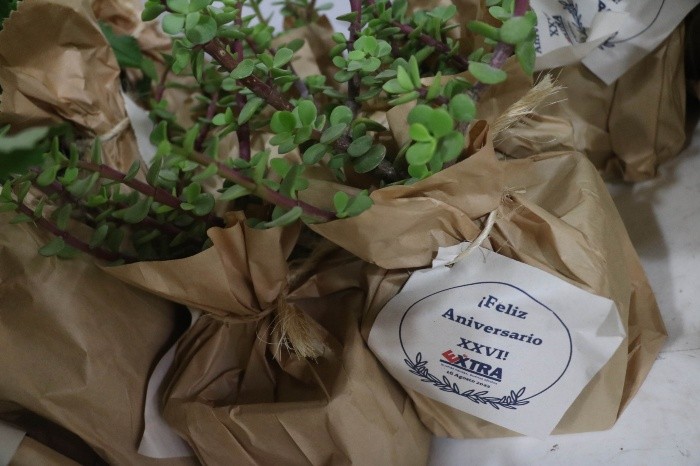 Esta tarde, en las instalaciones de Bosque Urbano de Extra, se celebró el 26 aniversario de la asociación civil que apoya a extrabajadores de medios de comunicación y pretende convertir la Zona Metropolitana de Guadalajara en una de las más arboladas a nivel nacional. En sus instalaciones, ubicadas en avenida Patria 1000 en el Bosque Colomos, se conmemoró la fecha con una celebración eucarística en la terraza principal, posteriormente comida con la amenización de un trovador. Al final, partieron el tradicional pastel.Juan Arturo Covarrubias Valenzuela, presidente de Bosque Urbano de Extra, destacó este aniversario y resaltó la labor altruista de ayudar a familias comprometidas con la comunicación en la Entidad, con beneficiarios en su mayoría de la tercera edad.“Estamos muy contentos por este 26 aniversario de Bosque Urbano, es un gran privilegio que llegue a esta edad y Bosque Urbano Extra A.C. es una asociación única en el mundo donde todos los medios de comunicación se juntan para ayudar a extrabajadores. Tenemos más de 500 familias, son cerca de dos mil 500 personas que ayudamos diariamente con seguros de gastos médicos, con seguros de vida, despensas, medicinas y esa es la labor con los extrabajadores que nos acompañaron a la misa”, comentó.Covarrubias Valenzuela resaltó que este año buscarán que la Zona Metropolitana de Guadalajara se convierta en una de las más verdes con múltiples especies de árboles.“Hoy tenemos un gran proyecto de convertir en Guadalajara en la ciudad más arbolada del país y estamos muy contentos del proyecto, este solo año estamos comprometiéndonos con 365 mil árboles, estamos entregando mil árboles diarios a mil familias y tenemos un sistema en donde los damos en adopción, la familia lo hace parte de su casa, esto nos da una supervivencia del 95% y estamos agradecidos. Es un proyecto que me llena el corazón”, acotó.Nora Escobar, coordinadora de trabajo social de Bosque Urbano de Extra A.C., es una de las colaboradoras con más años dentro de la Asociación Civil y para ella es importante el vínculo que ha tenido con todos los beneficiarios.“Para mí es toda una vida recorrida en conjunto con todos los beneficiarios, me he vuelto parte de ellos y ellos de mí, porque hemos recorrido 25 años juntos en los cuales me he involucrado en su situación familiar, económica, he sido como parte fundamental de que reciban el apoyo y de mi parte de Extra y toda la comitiva nos encargamos de apoyarlos y parte importante son sus despensas completas con más de cincuenta productos”, resaltó.JM