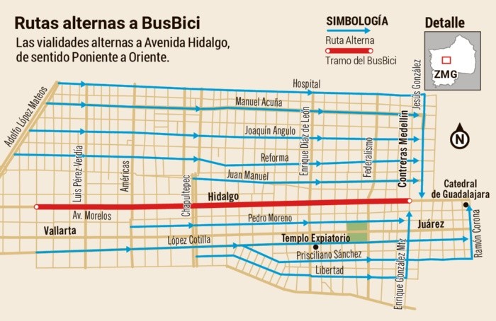 Automovilistas urgieron a la autoridad para que policías viales agilicen el tráfico en la zona donde se implementó el carril de BusBici en Avenida Hidalgo, en Guadalajara.Entrevistados por este medio señalaron que en las horas pico se congestiona el tramo del proyecto (comprendido entre Victoriano Salado Álvarez a Contreras Medellín, en el Centro de Guadalajara), debido a que no hay elementos viales. “Sí va a faltar mucha gente de vialidad para que pongan mano dura porque no hay y es un caos”, dijo Martín Navarro.El conductor también pidió que se sancione a quienes se detienen en el carril izquierdo porque crean el embotellamiento.“Si del lado derecho se va a complicar, entonces nos van a dejar dos carriles, porque el de la izquierda lo obstruyen porque están bajando artículos de belleza, hay un kínder o escuela que pone sus conos y me ha tocado batallarle allí”, añadió Navarro.El taxista Luis Ricardo dijo que el tráfico “está pesadísimo”, pues quitan un carril, pero los elementos viales no se aseguran de que los otros fluyan.Alberto Flores, otro automovilista, reconoció que “los choferes sí le estamos batallando, pero los que usen el carril exclusivo tendrán una ventaja”. Jesús Carlos Soto Morfín, director de Movilidad y Transporte del Ayuntamiento de Guadalajara, anunció que se prevé dar el banderazo de inauguración del BusBici el próximo domingo 4 o lunes 5 de septiembre.El costo de la multa por invadir el carril exclusivo será de 14 mil 433 pesos a 19 mil 244.Debido a la saturación vehicular que se registra en Avenida Hidalgo (principalmente a las horas pico) por la implementación del carril exclusivo para el BusBici, el Ayuntamiento de Guadalajara recomendó considerar las rutas alternas.Del lado derecho de Avenida Hidalgo se pueden utilizar como opciones las calles de López Cotilla, Prisciliano Sánchez y Libertad para bajar hacia el Centro.Del lado izquierdo, las alternativas son Juan Manuel, Reforma, Ángulo, Manuel Acuña y Hospital. Agregó que para dar más información al conductor se instalarán más señalamientos para que los automovilistas se informen de las alternativas viales.“Sí colocamos 16 pendones y estamos por colocar en otros puntos que van a ir informando de la exclusividad del carril, de la precaución a la vuelta a la derecha”, afirmó.Admitió que hay algunos momentos en que se genera caos vial, principalmente entre las 13 horas y las 15 horas.“Lo que hemos detectado hasta ahorita en las llamadas horas pico son aumentos en tiempos de traslado de 5 minutos. El tiempo que se tenía en todo el trayecto de Victoriano Salado Álvarez a Contreras Medellín es de 14 minutos en promedio y ahorita en algunos horarios el tiempo de traslado es de 19 minutos”, precisó.Añadió que después entre la Avenida Enrique Díaz de León y Conteras Medellín hay una especie de embotellamiento para acceder al paso desnivel de Hidalgo.Comentó que la carga vehicular de Federalismo es muy alta y eso le genera menos luz verde en Hidalgo, “ahí siempre ha sido un punto de acumulación con o sin el BusBici”.Falta realizar algunos ajustes de semáforos que ayudarán en la circulación, dijo. Según el funcionario, reforzarán con agentes de movilidad el programa de banquetas libres para inhibir que automovilistas se estacionan en el lado izquierdo sobre todo en las Avenidas Federalismo y Paseo Alcalde.El carril exclusivo sobre Avenida Hidalgo provocó molestias de los taxistas quienes dicen que tendrán problemas para subir y bajar pasaje en el punto.“Ni modo de agarrarlo de acá, arriesgando al pasaje que lo vayan a atropellar”, dijo Luis un taxista.Francisco López, otro taxista, dijo que “no podemos dar vuelta rápida a la derecha, nos afectó. Antes podíamos agarrar pasaje por aquí por Hidalgo por los hospitales y ya no podemos”.