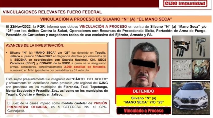 Este lunes el subsecretario de seguridad, Ricardo Mejía Berdeja, informó que Silvano “N”, alías “El 25” o el “F25”, ya fue vinculado a proceso.De acuerdo con el reporte Cero Impunidad, presentado esta mañana por el subsectetario en la “mañanera” del Presidente Andrés Manuel López Obrador, al “F25” se le vinculó por los delitos Contra la Salud, Operaciones con Recursos de Procedencia Ilícita, Portación de Armas de Fuego, Posesión de Cartuchos y Cargadores de Uso Exclusivo del Ejército y Fuerzas Armadas.La vinculación a proceso fue concedida el pasado martes 22 de noviembre, y a partir de ello permanecerá en prisión preventiva oficiosa, mientras dure su proceso penal, en el Cefereso n°12 de Guanajuato.Según el mismo reporte, a Sivano “N”, quien había sido integrante del Cartel del Golfo, se le identifica actualmente como jefe regional del Cartel Nueva Generación que lidera Nemesio Oceguera alias “El Mencho”, operando en los municipios de Florencia, Teul, Tepetongo, Monte Escobedo y Fresnillo, en Zacatecas, así como en los municipios de Tequila, Colotlán y Huejúcar, en Jalisco.De acuerdo con la Secretaría de la Defensa Nacional (Sedena), Silvano “N” es probable responsable de los homicidios de policías ministeriales, estatales, municipales y de seguridad vial del estado de Zacatecas; así como la presunción de estar vinculado con la quema de vehículos y bloqueos carreteros el 27 de agosto de 2022, en los municipios de Fresnillo, Enrique Estrada, Calera, Zacatecas, Villanueva y Jerez, Zacatecas.De acuerdo con la Sedena, la detención de Silvano “N” representa un golpe contundente a las organizaciones delictivas del país, “acción que refrenda el compromiso por parte del Ejército Mexicano de velar y salvaguardar el bienestar y la tranquilidad de los ciudadanos”. Según explicó la Sedena, del análisis de la información entre las diversas autoridades, se determinó que Silvano “N” se resguardaba en Tequila, Jalisco, por lo cual se integró entonces “una fuerza conjunta conformada por el Ejército Mexicano, la Guardia Nacional y la Secretaría de Seguridad y Protección Ciudadana” y se incrementaron los reconocimientos terrestres en citado municipio.Mediante una denuncia ciudadana, se logró localizar el vehículo que utilizaba para trasladarse Silvano “N”, por lo cual, el pasado 13 de noviembre, mientras circulaba por calles de ese municipio, se le marcó el alto para proceder a efectuarle una revisión, siendo detenido en flagrancia delictiva por personal militar.Durante la detención, la cual “se realizó sin necesidad de efectuar un solo disparo” al también conocido como “El Manoseca”, se le encontraron aproximadamente dos mil pastillas de probable fentanilo, cinco cargadores, un arma larga, un arma corta, se le aseguró el vehículo en el que viajaba y dinero aun no contabilizado.“Aunado a lo anterior, personal de la Coordinación Nacional Antisecuestro de la la Secretaría de Seguridad y Protección Ciudadana le cumplimentó una orden de aprehensión al presunto delincuente por el delito de privación ilegal de la libertad en contra de particulares, la cual giró un juez de control del estado de Zacatecas”, añadió la Sedena a través de un comunicado.GC