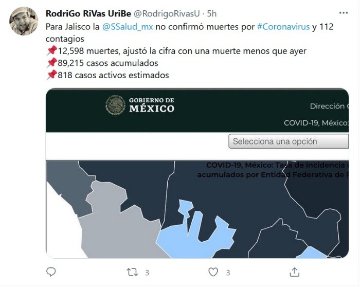 Mientras que el lunes se reportaron 142 casos de COVID-19 en un solo día, para el viernes la cifra ya había incrementado a 229 nuevos contagios en 24 horas, lo cual representa un aumento del 61% respecto del inicio de esta semana.Además el incremento ha sido sostenido, pues para el martes ya se habían registrado 160 nuevos casos en un solo día, el miércoles 194 y para el jueves se reportaban 221 contagios en 24 horas, según las estadísticas presentadas diariamente por la Secretaría de Salud Jalisco.Con los 229 casos nuevos reportados este viernes, el número de contagios acumulados ascendió a 254 mil 373 desde el inicio de la pandemia en marzo de 2020.Por otra parte este día cerró sin un solo fallecimiento a causa del virus de la COVID-19, por lo que la cifra de decesos se mantiene en 12 mil 598 desde que se confirmaron las dos primeras muertes en Jalisco a causa del virus el 23 de marzo del año pasado.A nivel nacional, el país registró 177 nuevas muertes por el virus en las últimas 24 horas, sumando un total de 233 mil 425 decesos, de acuerdo con la Secretaría de Salud Federal.Además, el informe técnico diario de la dependencia registró cinco mil 879 nuevos contagios, con los que se llega a dos millones 531 mil 229 casos confirmados.JM