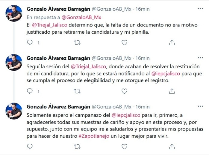 “Por decisión unánime ganamos el primer round”, declaró Gonzalo Álvarez Barragán luego de que el Tribunal Electoral de Jalisco (Triejal) resolviera a favor su candidatura a la presidencia municipal de Zapotlanejo. Ahora, el Instituto Electoral y de Participación Ciudadana (IEPC) iniciará el proceso de elegibilidad.El Triejal determinó que la falta de un documento no era motivo justificado para retirar la candidatura a Álvarez y su planilla.“Seguí la sesión del Tribunal Electoral del Estado de Jalisco, donde acaban de resolver la restitución de mi candidatura, por lo que se estará notificando al Instituto Electoral y de Participación Ciudadana para que se cumpla el proceso de elegibilidad y me otorgue el registro”, detalló el aspirante de Morena.“Solamente espero el campanazo del IEPC para ir, primero, a agradecerles todas sus muestras de cariño y apoyo en este proceso y, por supuesto, junto con mi equipo iré a saludarlos y presentarles mis propuestas para hacer de nuestro Zapotlanejo un lugar mejor para vivir”, aseguró Álvarez Barragán.JM