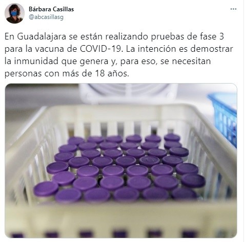 En Guadalajara ya se desarrollan pruebas en fase 3 para analizar la efectividad de una vacuna contra COVID-19, según dio a conocer la Coordinadora Estratégica de Desarrollo Social del Gobierno de Jalisco, Bárbara Casillas.Se trata de una vacuna probada por PanAmerican Clinical Research, un Centro de Investigación Médica que sirve a patrocinadores farmacéuticos, proveedores de ensayos virtuales y organizaciones de salud global en América del Sur, Central y del Norte.La intención, refirió la coordinadora a través de sus redes sociales, es demostrar la inmunidad que genera la vacuna, para lo cual se necesitan personas voluntarias mayores de 18 años que no hayan presentado COVID-19, no hayan recibido algún trasplante de órganos y que no padezcan alguna enfermedad que afecte sus defensas.Las personas interesadas en participar en este estudio deben ingresar a la plataforma https://www.panamclinicalresearch.com/estudio-covid-19/, donde deberán llenar un breve formulario con sus datos de contacto, y posteriormente recibirán un correo con información adicional para verificar si son candidatos o no a ser parte del ejercicio.De acuerdo con el centro de investigación, el estudio en fase 3 se realiza en más de 30 mil voluntarios alrededor del mundo. “En las Fases I y II ya se demostró la seguridad de la vacuna y la dosis óptima”, señala en su página web. El objetivo de esta fase, añade, es demostrar que la vacuna genera inmunidad y previene la enfermedad COVID-19.“Los voluntarios recibirán una dosis inicial y un refuerzo de la vacuna, y se mantendrán en seguimiento por un equipo de médicos con amplia experiencia. Los voluntarios deben ser personas mayores 18 años de edad. En caso de tener alguna enfermedad crónica, pueden participar si están en tratamiento y control”, refiere en un mensaje mostrado en su plataforma.Hasta el momento se desconoce la temporalidad del estudio y cuándo se tendrían los resultados del mismo para la posible distribución de la vacuna. NR